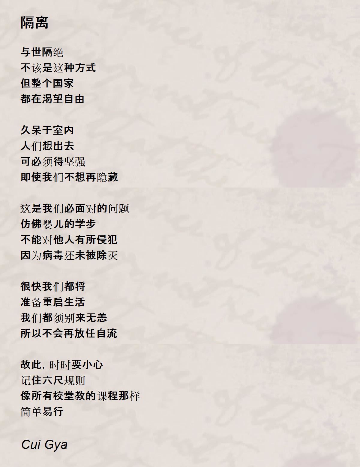 与世隔绝 不该是这种方式 但整个国家 都在渴望自由 久呆于室内 人们想出去 可必须得坚强 即使我们不想再隐藏 这是我们必面对的问题 仿佛婴儿的学步 不能对他人有所侵犯 因为病毒还未被除灭 很快我们都将 准备重启生活 我们都须别来无恙 所以不会再放任自流 故此,时时要小心 记住六尺规则 像所有校堂教的课程那样 简单易行