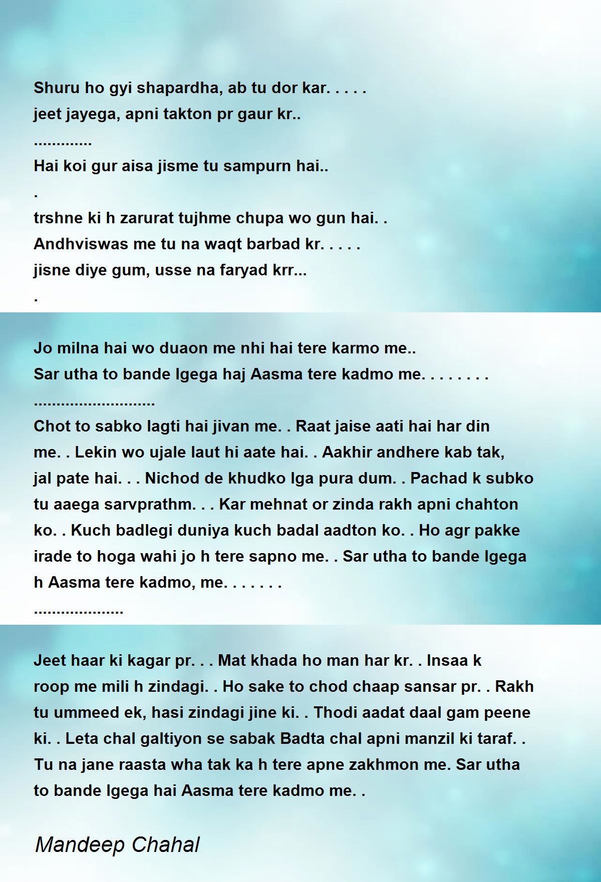 Jeet haar ki kagar pr... Mat khada ho man har kr.. Insaa k roop me mili h zindagi.. Ho sake to chod chaap sansar pr.. Rakh tu ummeed ek, hasi zindagi jine ki.. Thodi aadat daal gam peene ki.. Leta chal galtiyon se sabak Badta chal apni manzil ki taraf.. Tu na jane raasta wha tak ka h tere apne zakhmon me. Sar utha to bande lgega hai Aasma tere kadmo me..