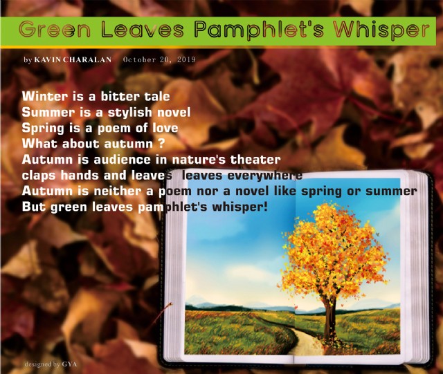冬天是痛苦的故事 夏天是时髦的小说 春天是首爱情诗 秋天如何? 秋天是自然剧场的观众 拍手离开留下片片落叶 秋天既非春天般的诗,也非夏天般的小说 但绿叶笔记低低细语!