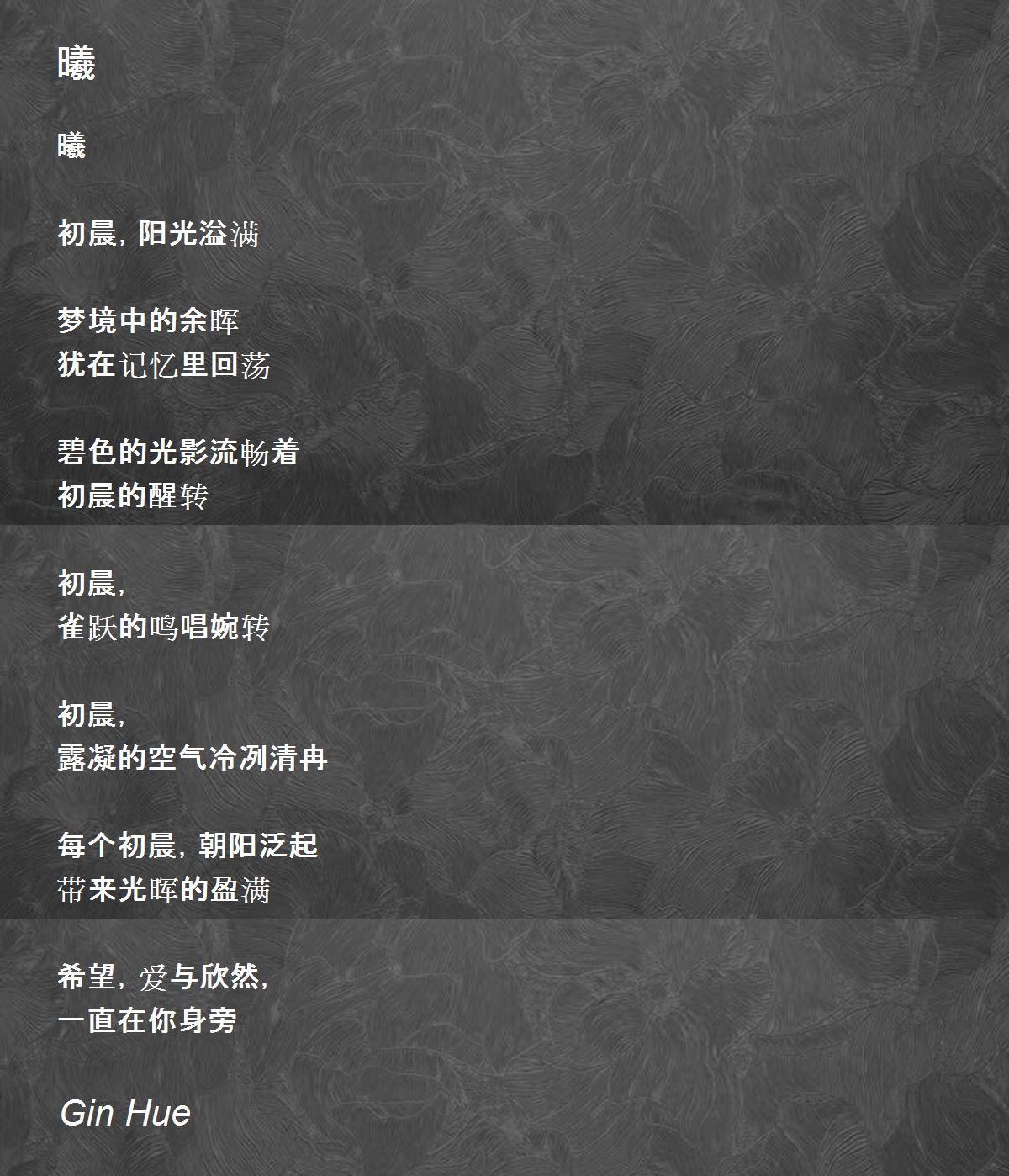 曦 初晨,阳光溢满 梦境中的余晖 犹在记忆里回荡 碧色的光影流畅着 初晨的醒转 初晨, 雀跃的鸣唱婉转 初晨, 露凝的空气冷冽清冉 每个初晨,朝阳泛起 带来光晖的盈满 希望,爱与欣然, 一直在你身旁