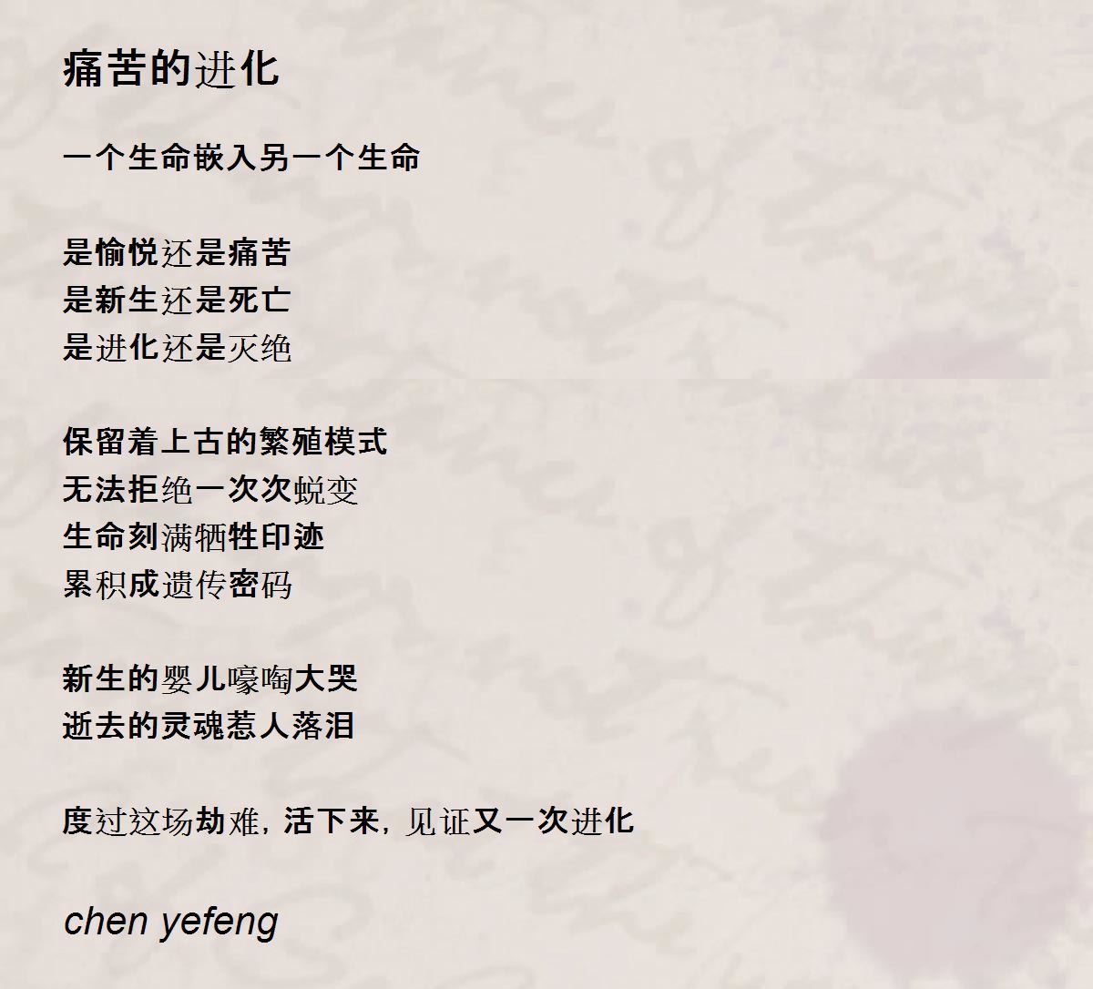 一个生命嵌入另一个生命 是愉悦还是痛苦 是新生还是死亡 是进化还是灭绝 保留着上古的繁殖模式 无法拒绝一次次蜕变 生命刻满牺牲印迹 累积成遗传密码 新生的婴儿嚎啕大哭 逝去的灵魂惹人落泪 度过这场劫难,活下来,见证又一次进化