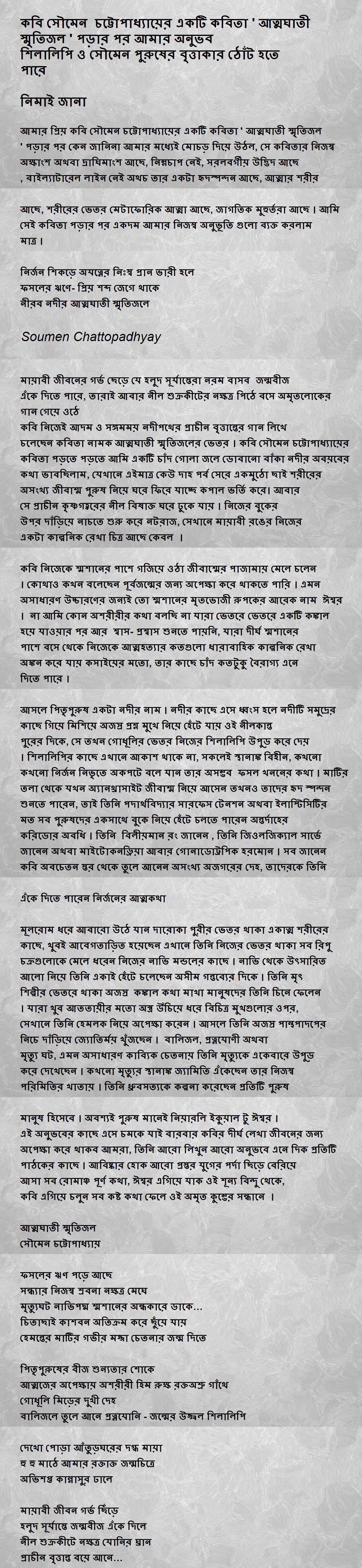 আমার প্রিয় কবি সৌমেন চট্টোপাধ্যায়ের একটি কবিতা ' আত্মঘাতী স্মৃতিজল ' পড়ার পর কেন জানিনা আমার মধ্যেই মোচড় দিয়ে উঠল, সে কবিতার নিজস্ব অক্ষাংশ অথবা দ্রাঘিমাংশ আছে, নিম্নচাপ নেই, সরলবর্গীয় উদ্ভিদ আছে , বাইল্যাটারেল লাইন নেই অথচ তার একটা হৃদস্পন্দন আছে, আত্মার শরীর আছে, শরীরের ভেতর মেটাফোরিক আত্মা আছে, জাগতিক মুহুর্তরা আছে । আমি সেই কবিতা পড়ার পর একদম আমার নিজস্ব অনুভূতি গুলো ব্যক্ত করলাম মাত্র ।