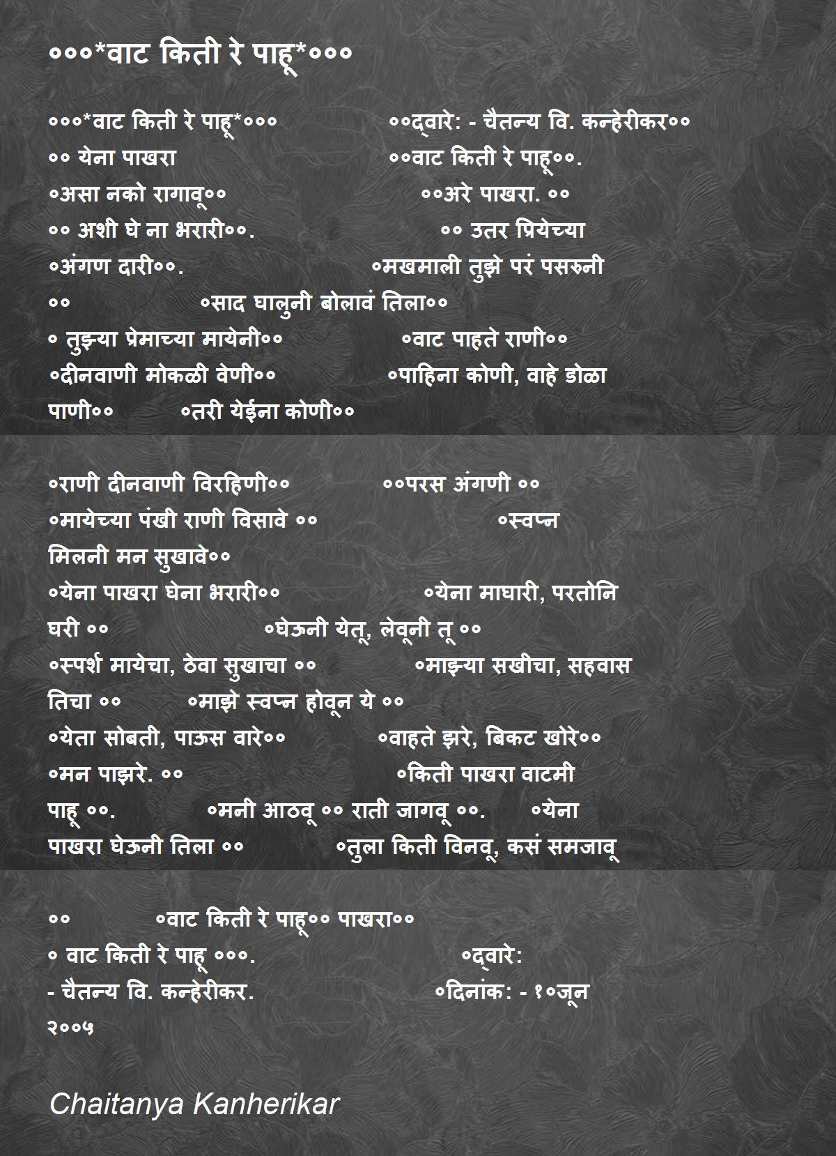 ०००*वाट किती रे पाहू*००० ००द्वारे: -चैतन्य वि.कन्हेरीकर०० ०० येना पाखरा ००वाट किती रे पाहू००. ०असा नको रागावू०० ००अरे पाखरा.०० ०० अशी घे ना भरारी००. ०० उतर प्रियेच्या ०अंगण दारी००. ०मखमाली तुझे परं पसरुनी ०० ०साद घालुनी बोलावं तिला०० ० तुझ्या प्रेमाच्या मायेनी०० ०वाट पाहते राणी०० ०दीनवाणी मोकळी वेणी०० ०पाहिना कोणी, वाहे डोळा पाणी०० ०तरी येईना कोणी००