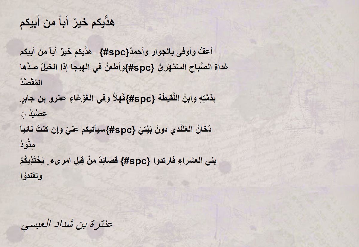 هدُّيكم خيرٌ أباً من أبيكم {#spc}أعفُّ وأوفى بالجوار وأحمدُ