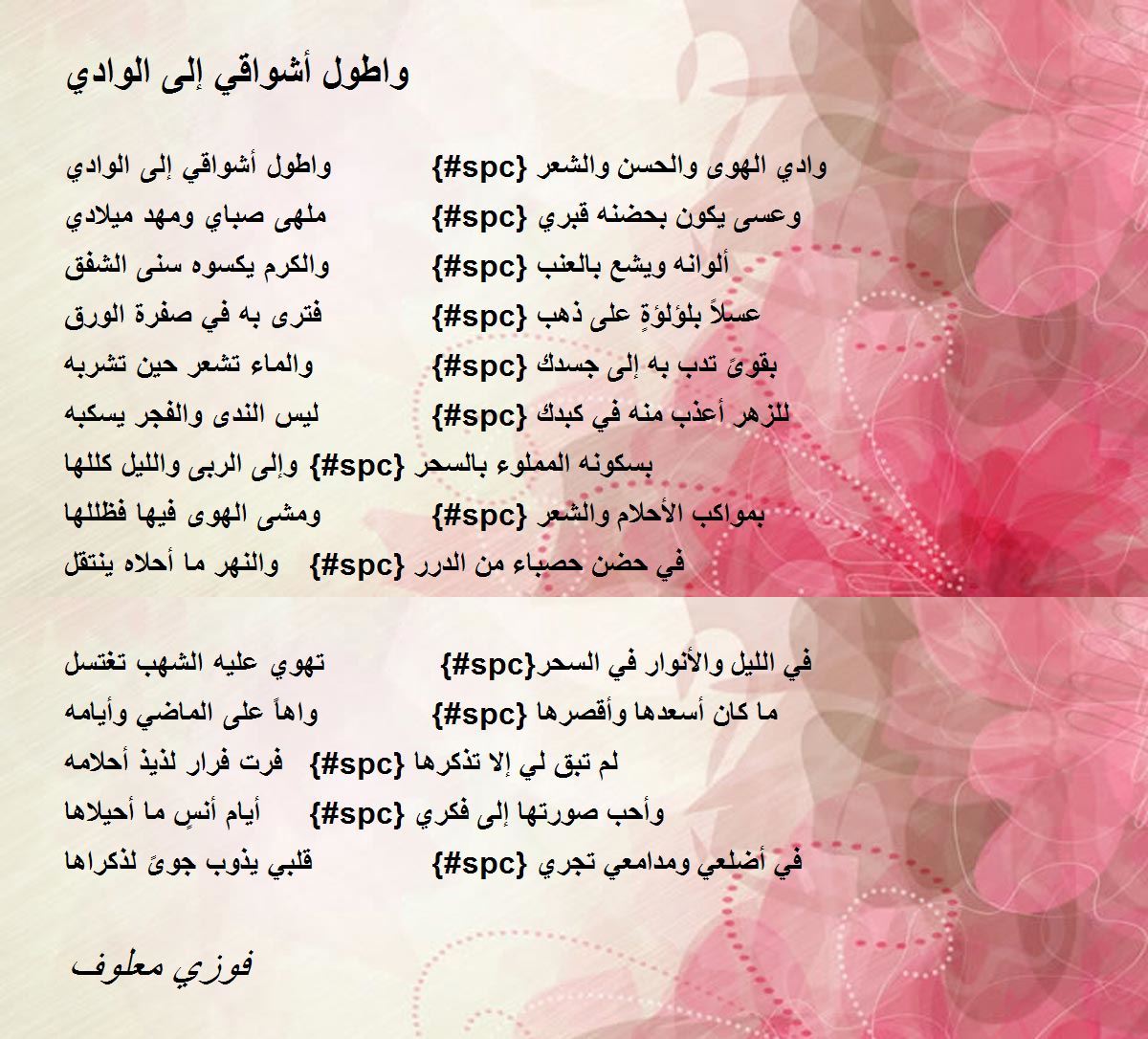 واطول أشواقي إلى الوادي {#spc} وادي الهوى والحسن والشعر