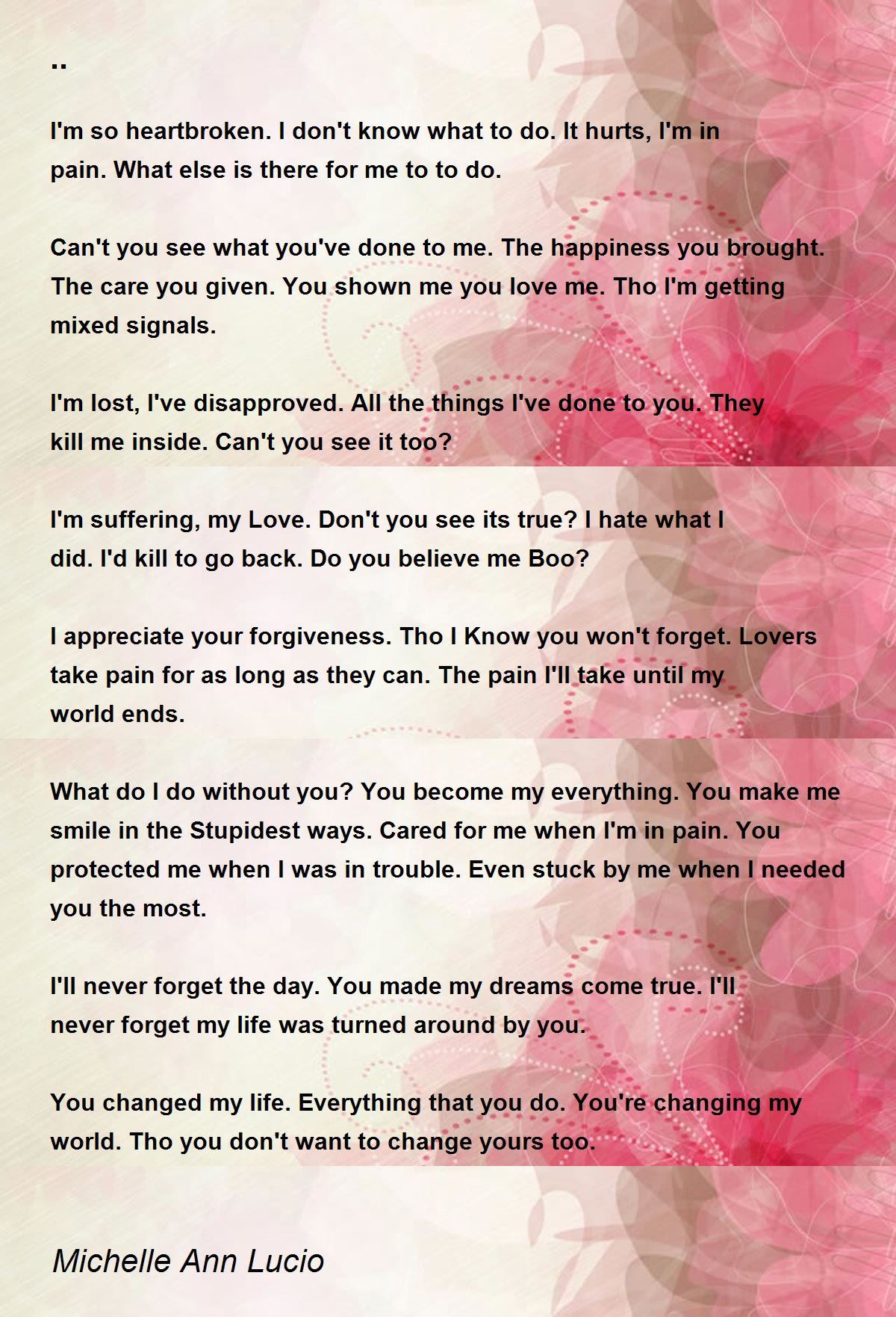 I'm suffering, my Love. Don't you see its true? I hate what I did. I'd kill to go back. Do you believe me Boo?