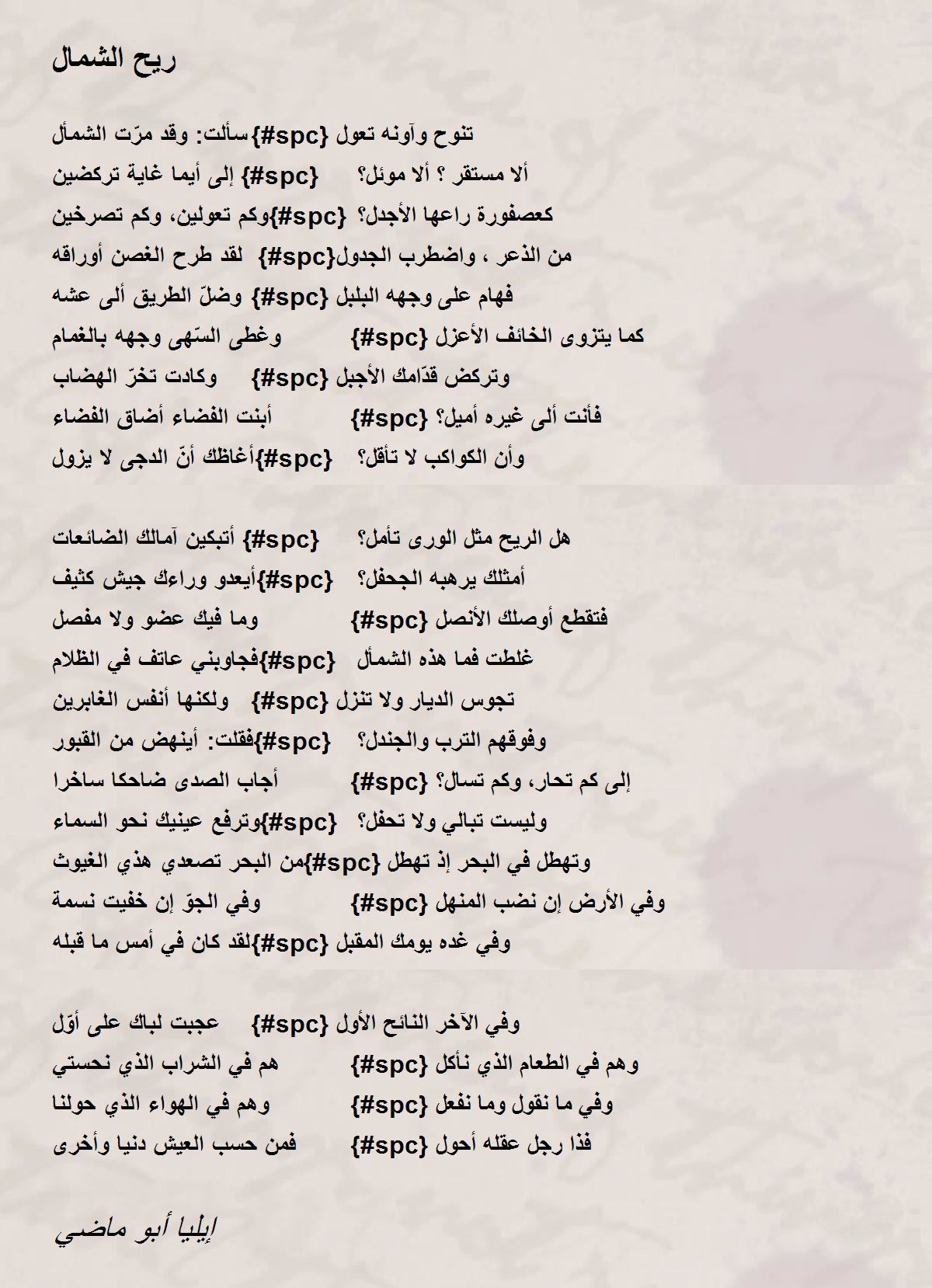 أتبكين آمالك الضائعات {#spc} هل الريح مثل الورى تأمل؟