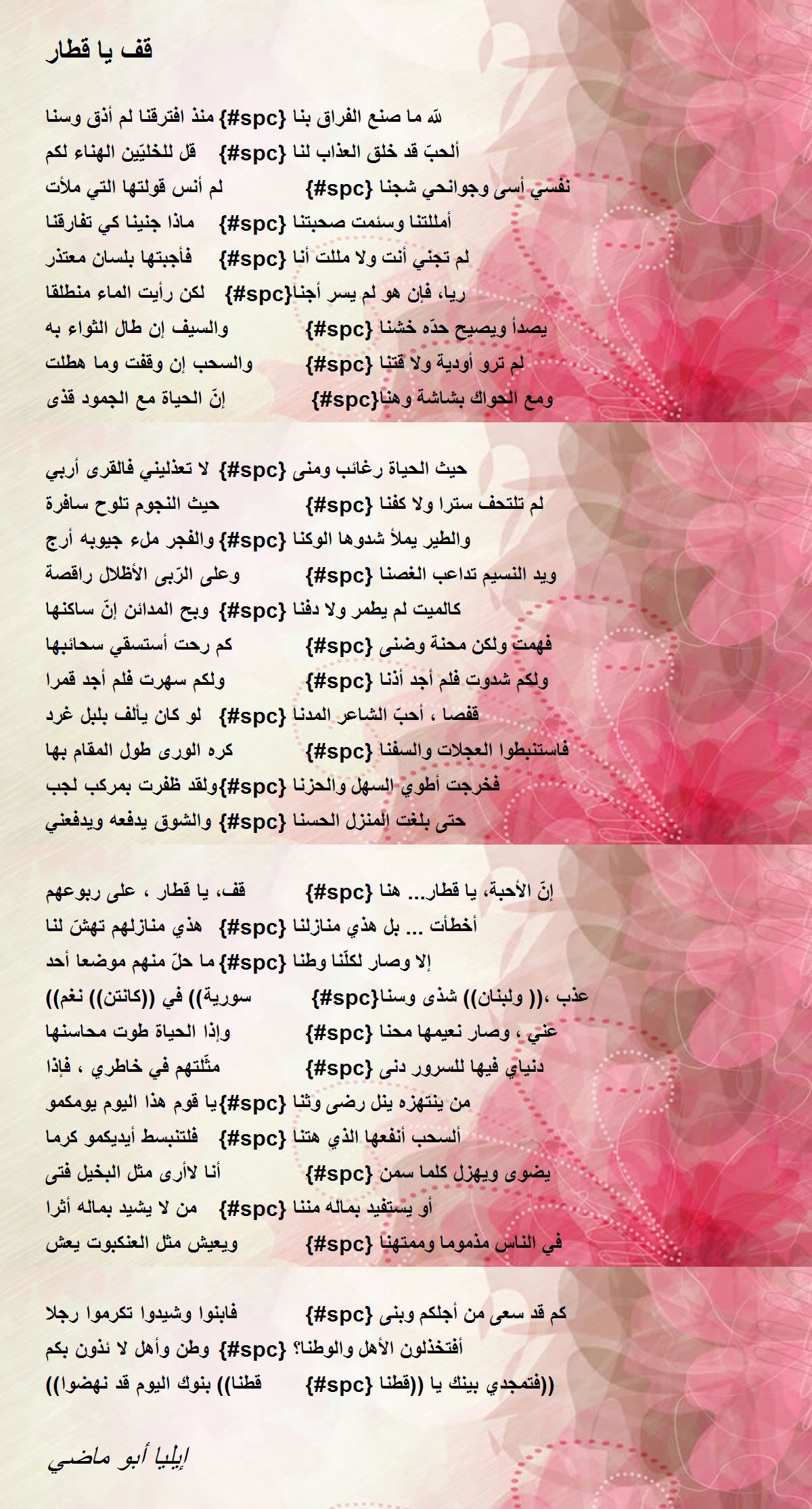 قف، يا قطار ، على ربوعهم {#spc} إنّ الأحبة، يا قطار... هنا