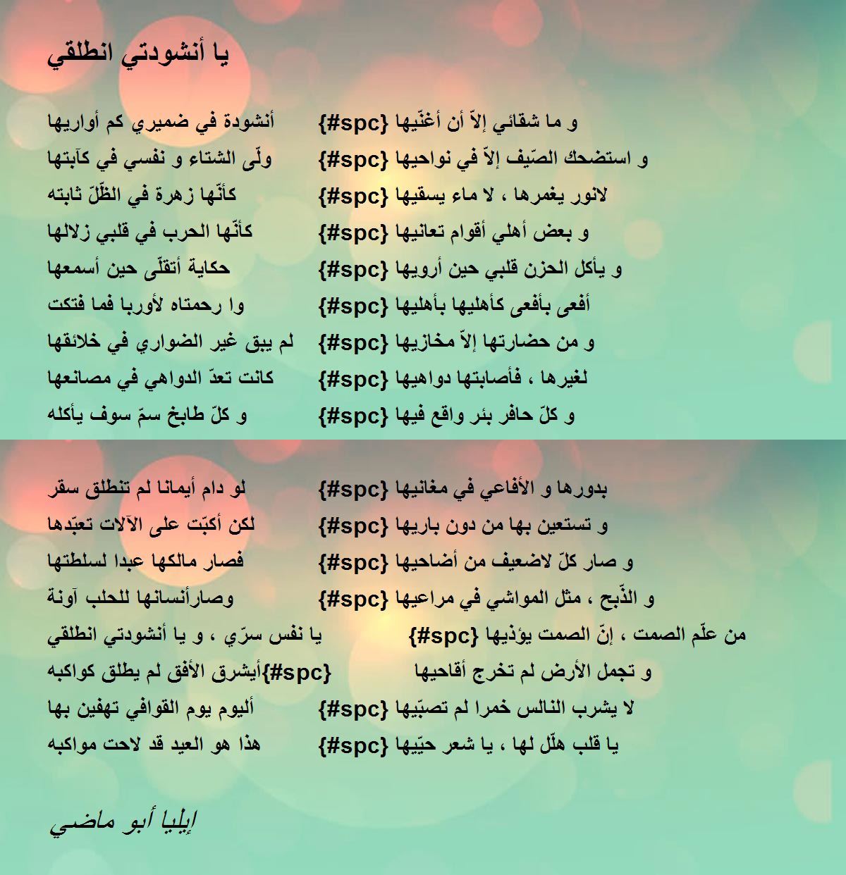 أنشودة في ضميري كم أواريها {#spc} و ما شقائي إلاّ أن أغنّيها