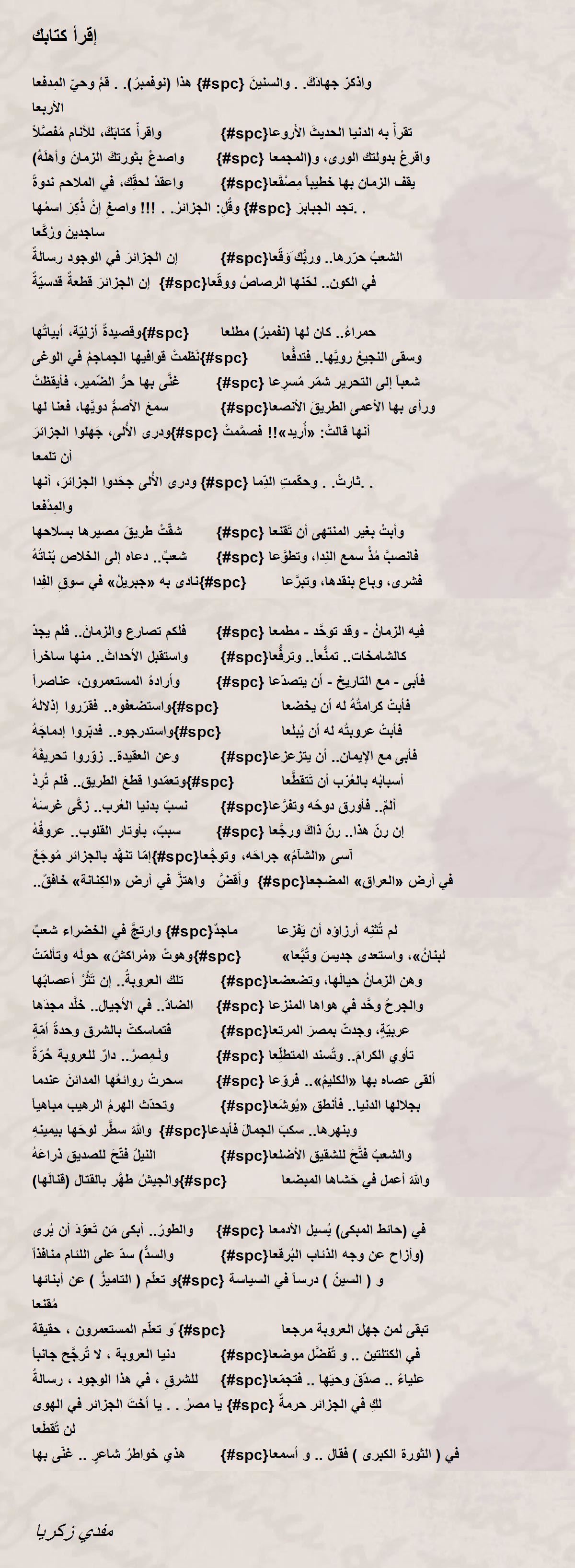 إن الجزائرَ في الوجود رسالةٌ {#spc}الشعبُ حرّرها.. وربُّك َوَقّعا