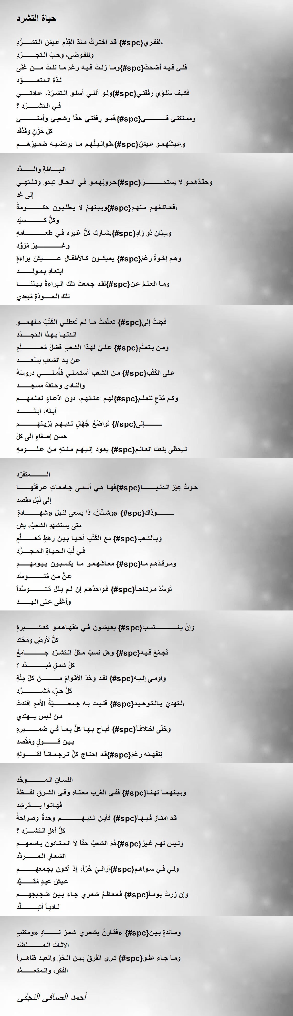 وهل نسبٌ مـثلُ الـتشـرّدِ جـــــــــــــامعٌ {#spc}تَجـمّعَ فـيـه كلُّ شمـلٍ مُبـــــــــــــدَّد ؟