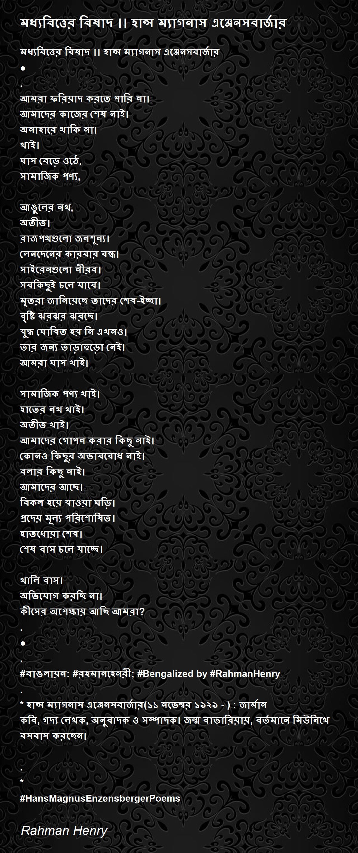 * হান্স ম্যাগনাস এঞ্জেনসবার্জার(১১ নভেম্বর ১৯২৯ -) : জার্মান কবি, গদ্য লেখক, অনুবাদক ও সম্পাদক। জন্ম বাভারিয়ায়, বর্তমানে মিউনিখে বসবাস করছেন।