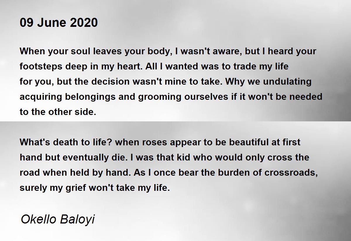 When your soul leaves your body, I wasn't aware, but I heard your footsteps deep in my heart. All I wanted was to trade my life for you, but the decision wasn't mine to take. Why we undulating acquiring belongings and grooming ourselves if it won't be needed to the other side.