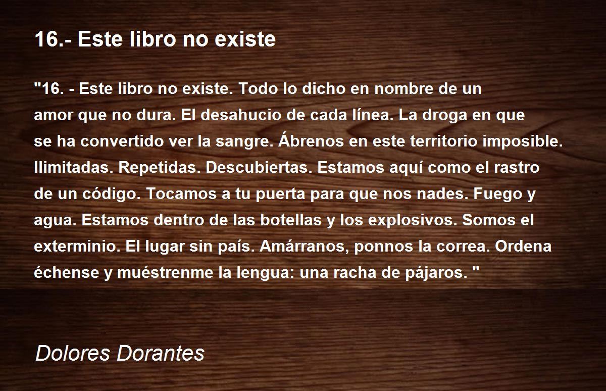 "16.- Este libro no existe. Todo lo dicho en nombre de un amor que no dura. El desahucio de cada línea. La droga en que se ha convertido ver la sangre. Ábrenos en este territorio imposible. Ilimitadas. Repetidas. Descubiertas. Estamos aquí como el rastro de un código. Tocamos a tu puerta para que nos nades. Fuego y agua. Estamos dentro de las botellas y los explosivos. Somos el exterminio. El lugar sin país. Amárranos, ponnos la correa. Ordena échense y muéstrenme la lengua: una racha de pájaros."