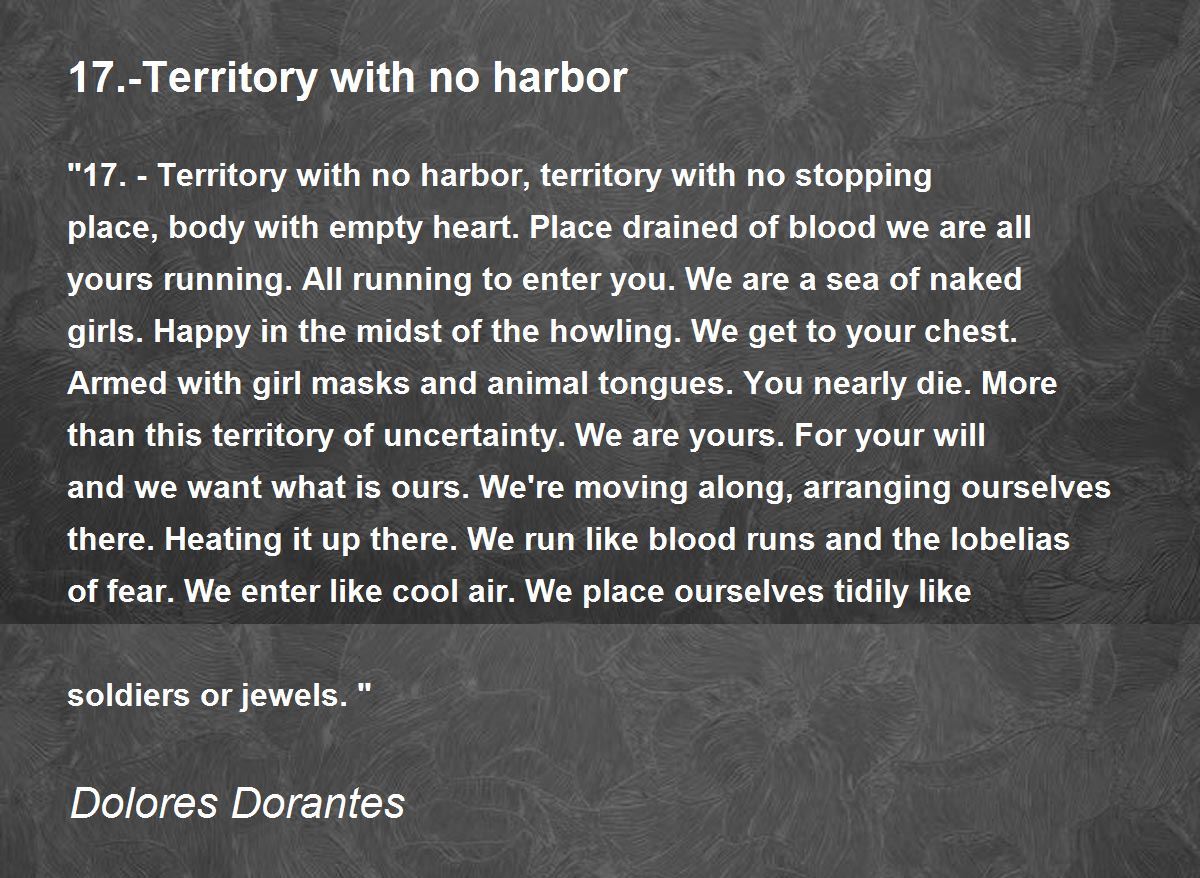 "17.-Territory with no harbor, territory with no stopping place, body with empty heart. Place drained of blood we are all yours running. All running to enter you. We are a sea of naked girls. Happy in the midst of the howling. We get to your chest. Armed with girl masks and animal tongues. You nearly die. More than this territory of uncertainty. We are yours. For your will and we want what is ours. We're moving along, arranging ourselves there. Heating it up there. We run like blood runs and the lobelias of fear. We enter like cool air. We place ourselves tidily like soldiers or jewels."