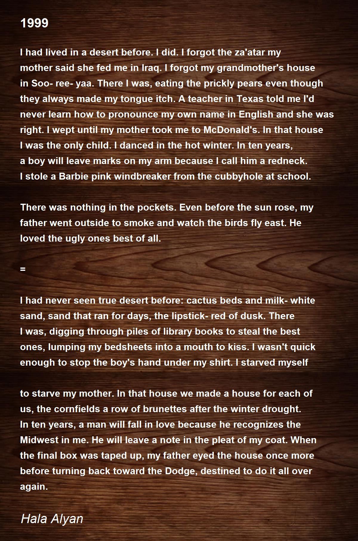 I had lived in a desert before. I did. I forgot the za'atar my mother said she fed me in Iraq. I forgot my grandmother's house in Soo-ree-yaa. There I was, eating the prickly pears even though they always made my tongue itch. A teacher in Texas told me I'd never learn how to pronounce my own name in English and she was right. I wept until my mother took me to McDonald's. In that house I was the only child. I danced in the hot winter. In ten years, a boy will leave marks on my arm because I call him a redneck. I stole a Barbie pink windbreaker from the cubbyhole at school. There was nothing in the pockets. Even before the sun rose, my father went outside to smoke and watch the birds fly east. He loved the ugly ones best of all.