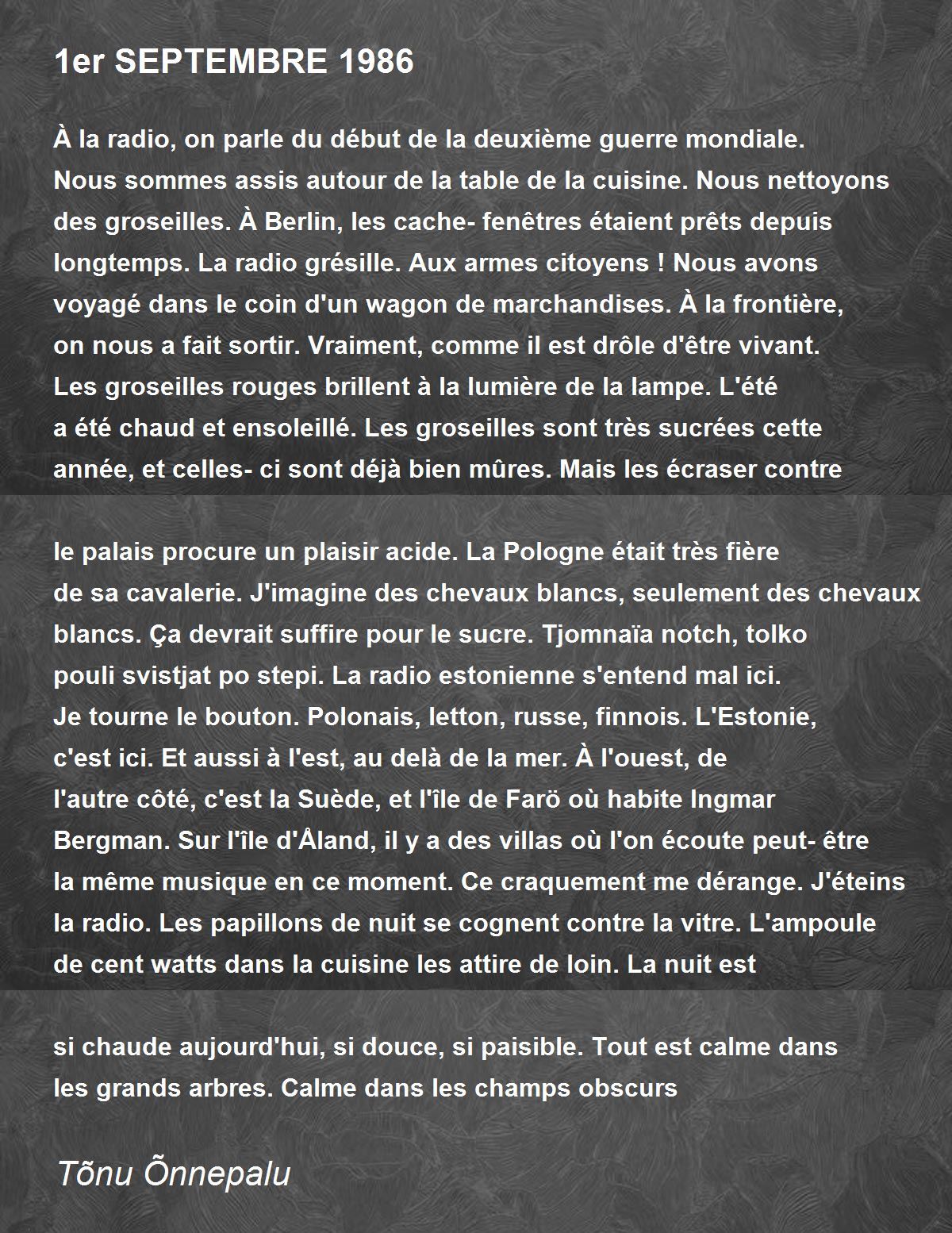 À la radio, on parle du début de la deuxième guerre mondiale. Nous sommes assis autour de la table de la cuisine. Nous nettoyons des groseilles. À Berlin, les cache-fenêtres étaient prêts depuis longtemps. La radio grésille. Aux armes citoyens ! Nous avons voyagé dans le coin d'un wagon de marchandises. À la frontière, on nous a fait sortir. Vraiment, comme il est drôle d'être vivant. Les groseilles rouges brillent à la lumière de la lampe. L'été a été chaud et ensoleillé. Les groseilles sont très sucrées cette année, et celles-ci sont déjà bien mûres. Mais les écraser contre le palais procure un plaisir acide. La Pologne était très fière de sa cavalerie. J'imagine des chevaux blancs, seulement des chevaux blancs. Ça devrait suffire pour le sucre.Tjomnaïa notch, tolko pouli svistjat po stepi. La radio estonienne s'entend mal ici. Je tourne le bouton. Polonais, letton, russe, finnois. L'Estonie, c'est ici. Et aussi à l'est, au delà de la mer. À l'ouest, de l'autre côté, c'est la Suède, et l'île de Farö où habite Ingmar Bergman. Sur l'île d'Åland, il y a des villas où l'on écoute peut-être la même musique en ce moment. Ce craquement me dérange. J'éteins la radio. Les papillons de nuit se cognent contre la vitre. L'ampoule de cent watts dans la cuisine les attire de loin. La nuit est si chaude aujourd'hui, si douce, si paisible. Tout est calme dans les grands arbres. Calme dans les champs obscurs