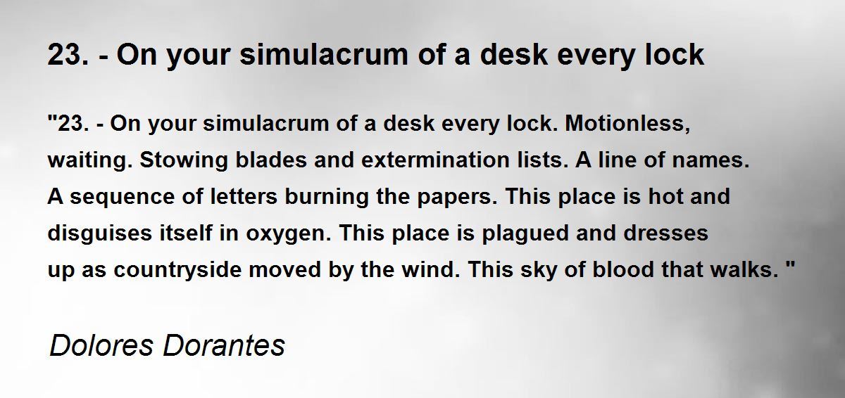 "23.-On your simulacrum of a desk every lock. Motionless, waiting. Stowing blades and extermination lists. A line of names. A sequence of letters burning the papers. This place is hot and disguises itself in oxygen. This place is plagued and dresses up as countryside moved by the wind. This sky of blood that walks."