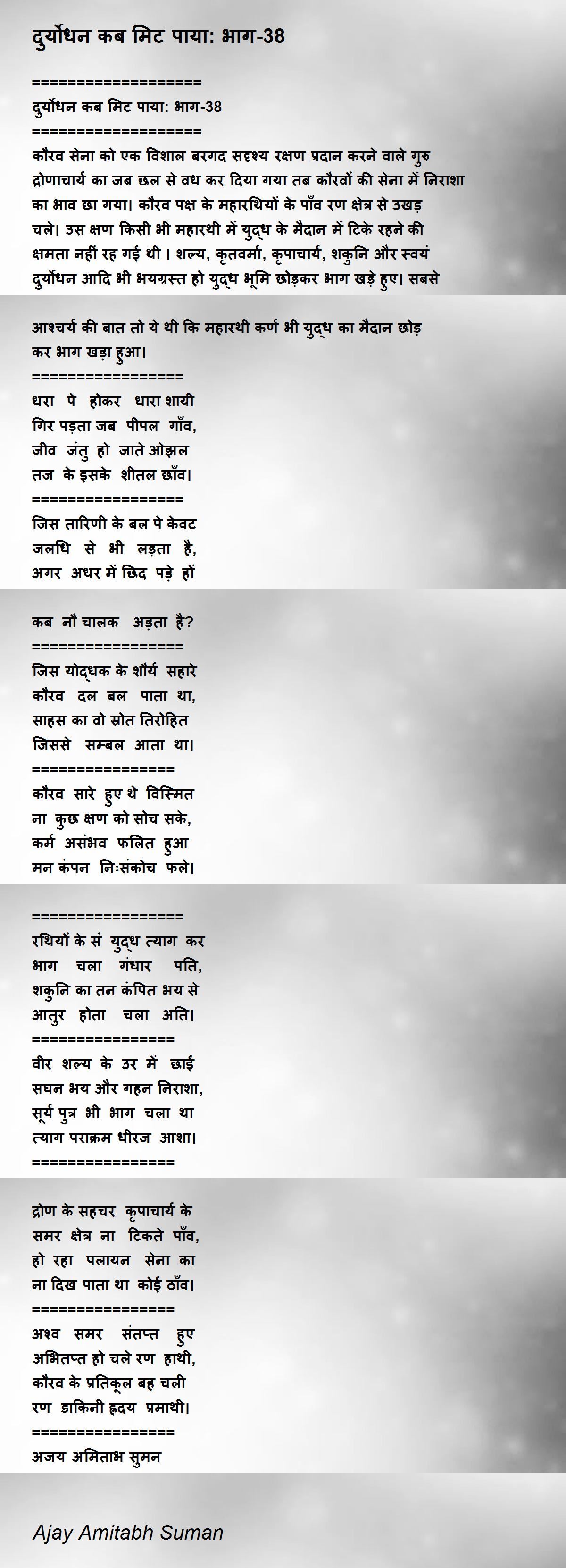 कौरव सेना को एक विशाल बरगद सदृश्य रक्षण प्रदान करने वाले गुरु द्रोणाचार्य का जब छल से वध कर दिया गया तब कौरवों की सेना में निराशा का भाव छा गया। कौरव पक्ष के महारथियों के पाँव रण क्षेत्र से उखड़ चले। उस क्षण किसी भी महारथी में युद्ध के मैदान में टिके रहने की क्षमता नहीं रह गई थी । शल्य, कृतवर्मा, कृपाचार्य, शकुनि और स्वयं दुर्योधन आदि भी भयग्रस्त हो युद्ध भूमि छोड़कर भाग खड़े हुए। सबसे आश्चर्य की बात तो ये थी कि महारथी कर्ण भी युद्ध का मैदान छोड़ कर भाग खड़ा हुआ।
