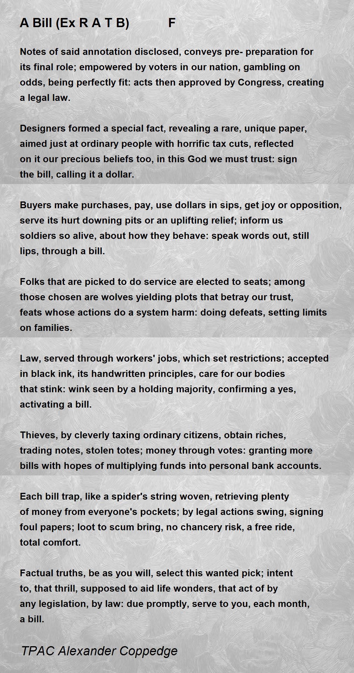 Buyers make purchases, pay, use dollars in sips, get joy or opposition, serve its hurt downing pits or an uplifting relief; inform us soldiers so alive, about how they behave: speak words out, still lips, through a bill.