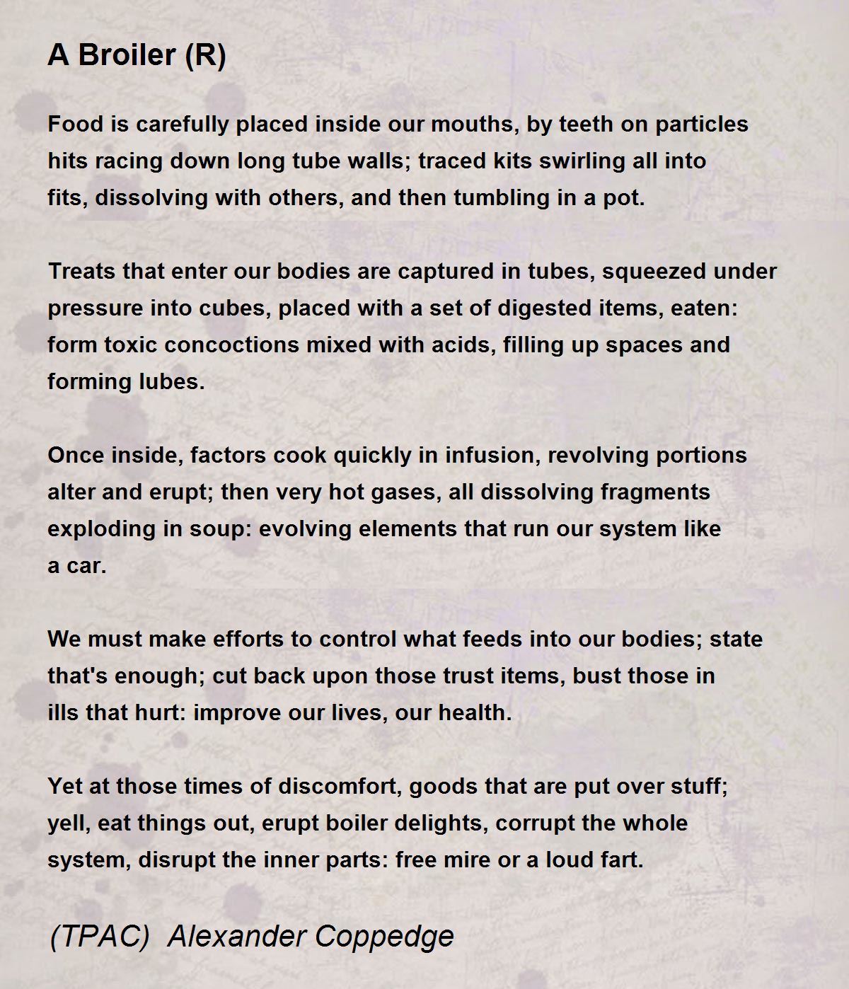 Once inside, factors cook quickly in infusion, revolving portions alter and erupt; then very hot gases, all dissolving fragments exploding in soup: evolving elements that run our system like a car.