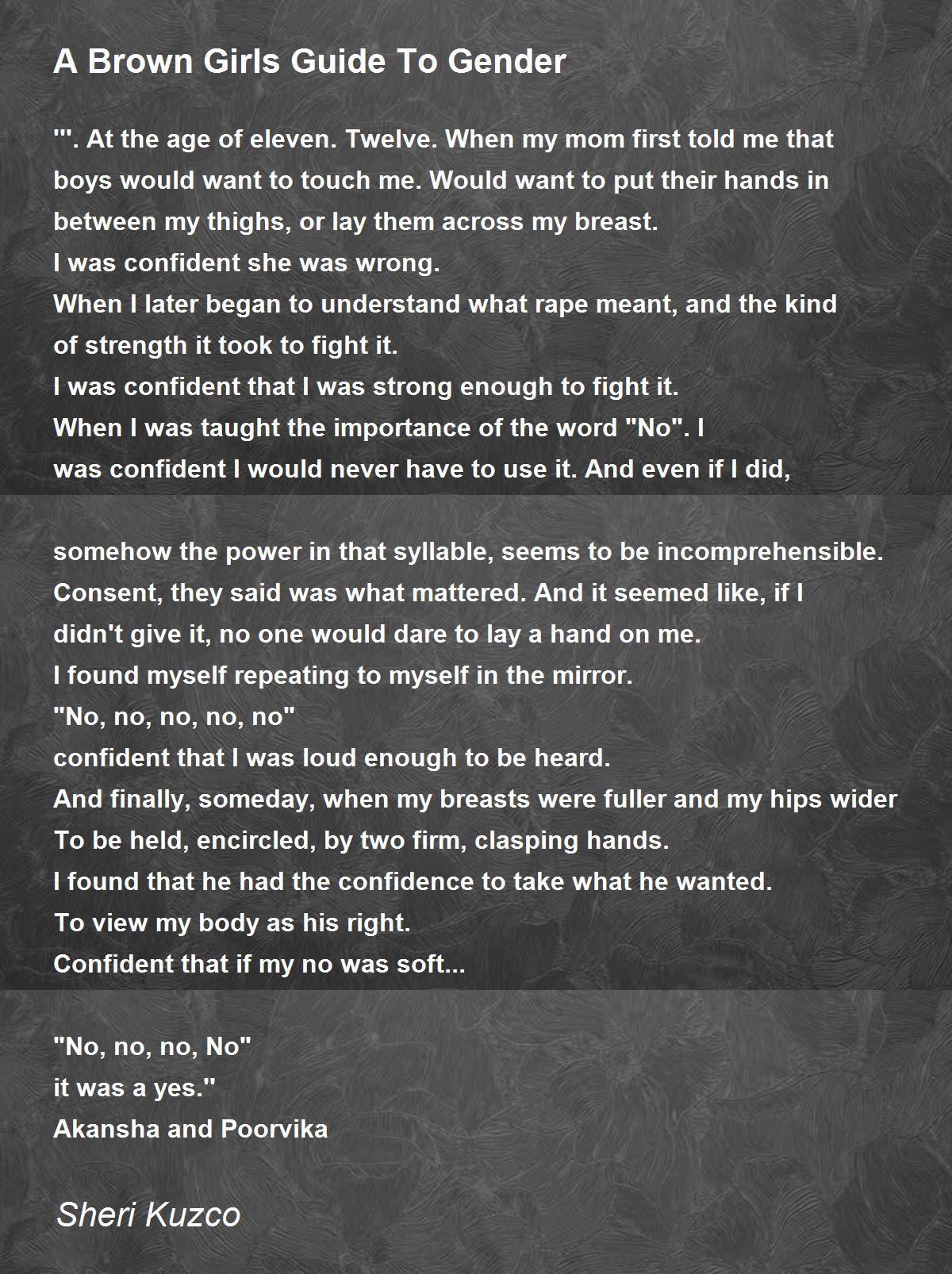 '''.At the age of eleven. Twelve. When my mom first told me that boys would want to touch me. Would want to put their hands in between my thighs, or lay them across my breast.