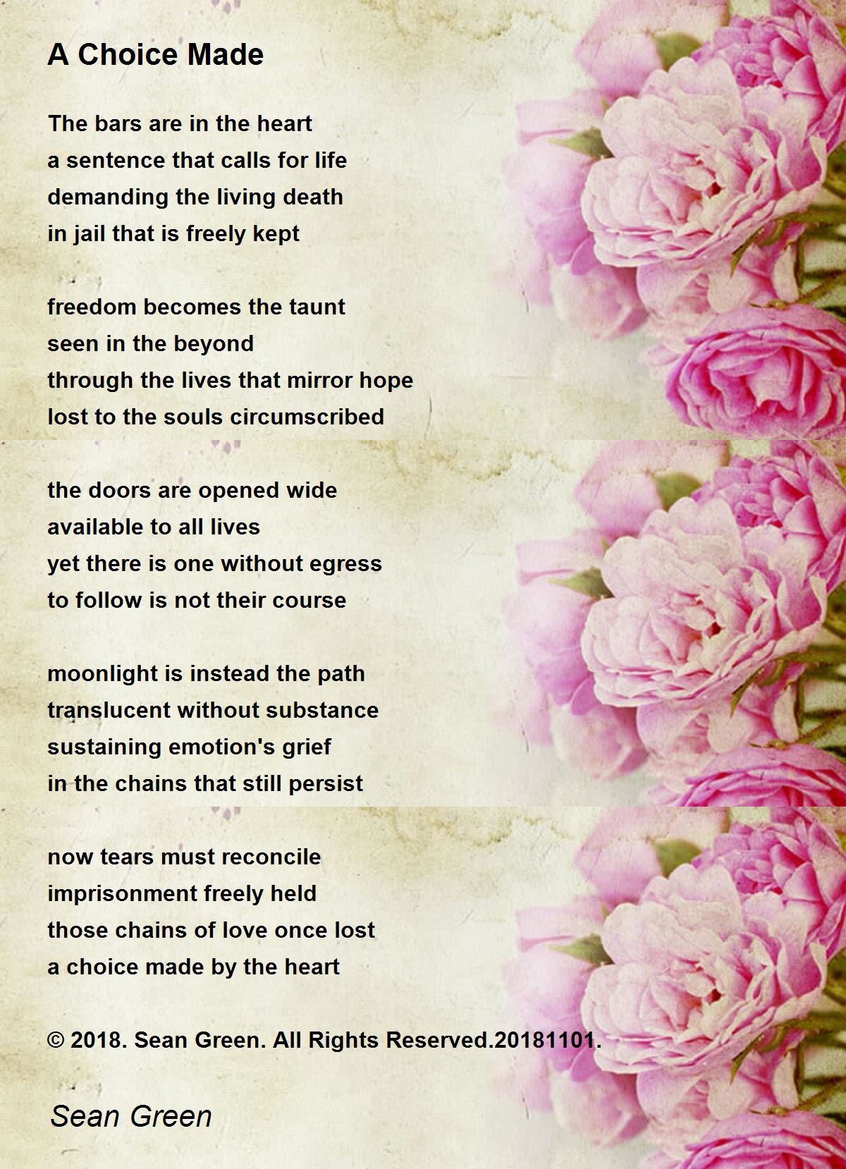 now tears must reconcile imprisonment freely held those chains of love once lost a choice made by the heart. freedom, the woman in the picture. a fine poem. tony