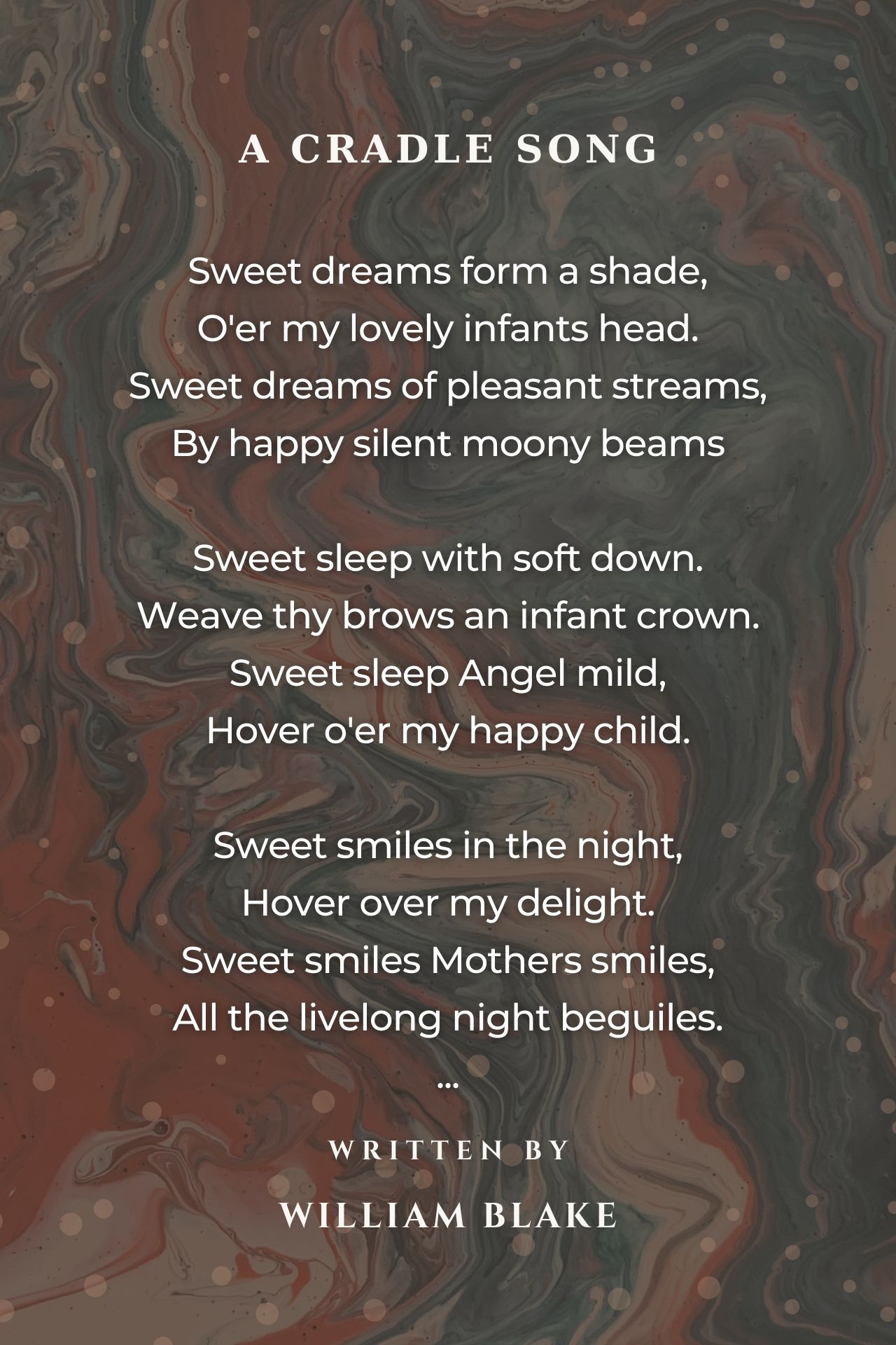 ‘A Cradle Song’ by William Blake is a poem about universal love for babies. The innocence Blake believed all children possessed at this age, and this love of innocence, moves from the love of Mother’s for their children, into God’s love for all babies given from Heaven; expressed as ‘Infant smiles are His own smiles, /Heaven & earth to peace beguiles.’ Babies smiles are the smile of God and enchant Heaven and earth with an ability to attract and maintain attention with a feeling of peace surrounding their sweet angelic sleep. The lines ‘Weave thy brows an infant crown./Sweet sleep Angel mild, /Hover o'er my happy child’ reminds of the birth of a king recognized as such by three wise men, who give gifts appropriate to a king. ‘Hover over my delight’ extends imagery of sleep, love, especially the love of ‘Mothers’ and angels, watching over a sleeping child with repetition of the word ‘Hover’. All healthy blessed babies have ‘Sweet moans, dovelike sighs, ... All the dovelike moans’ yet the line ‘All creation slept and smil'd.’ Firmly reminds us of Blake’s belief that God was once born as flesh in the person of Jesus Christ. All babies in a cradle are spoken of with ‘Sweet babe in thy face, /Holy image I can trace’ but again Blake specifically references Jesus continuing with ‘Sweet babe once like thee. /Thy maker lay and wept for me’. Blake boldly confirms Christian belief that Christ was born for all of us, all people across all history before and after him with, ‘Wept for me for thee for all, /When he was an infant small.’ Through one birth this ‘Heavenly face that smiles on thee, /Smiles on thee on me on all, /Who became an infant small, beautifully expresses God’s love for all his creation, all humanity. For God so loved that world that he was willing to give his only begotten son is a theme running through this poem.