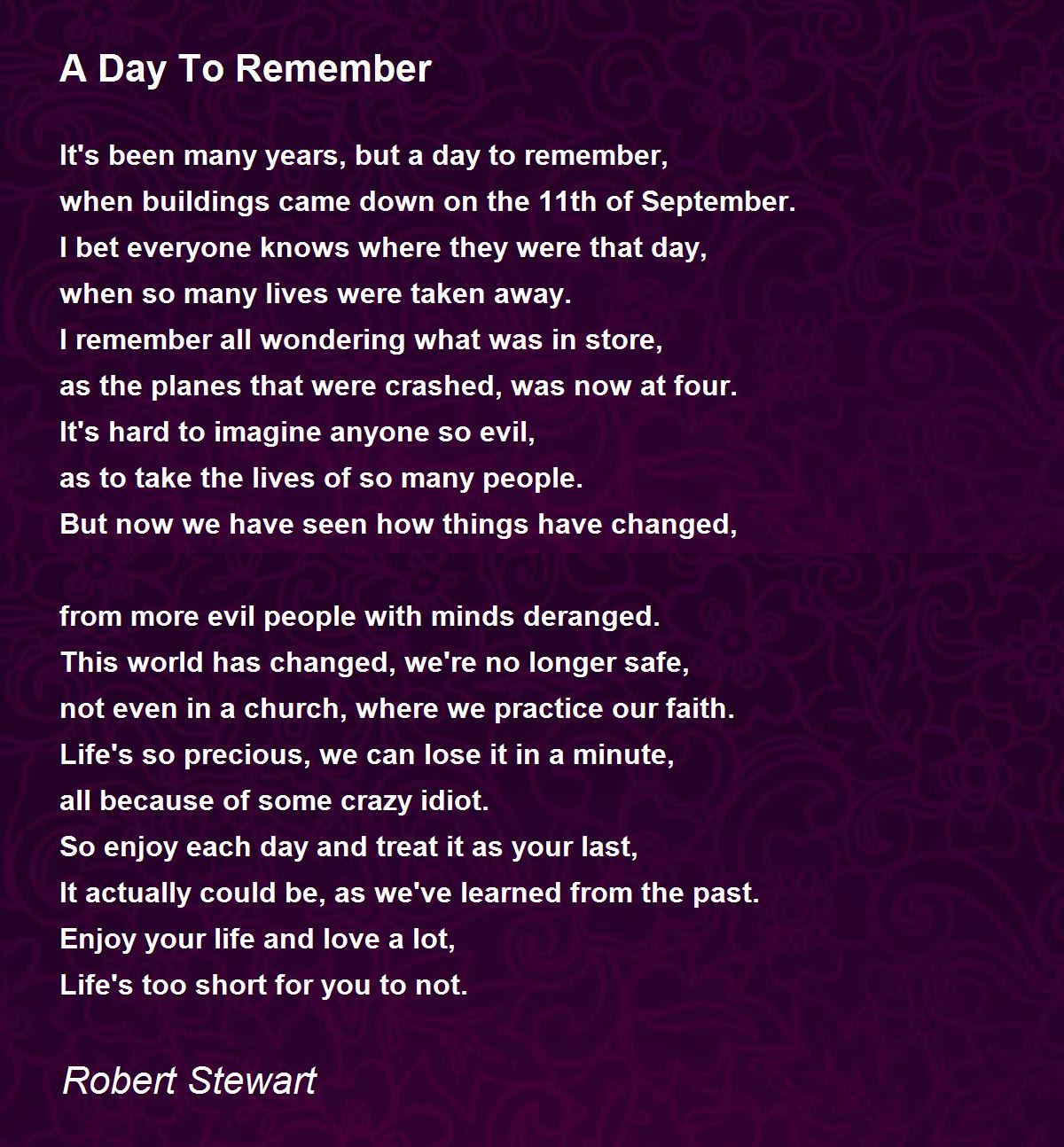 This world has changed, we're no longer safe, not even in a church, where we practice our faith. Life's so precious, we can lose it in a minute, all because of some crazy idiot. very nice advice.. so enjoy everyday as u can and take every moment as a gracious gift of God. Death can always be there so unexpected.. a very nice poem. tony