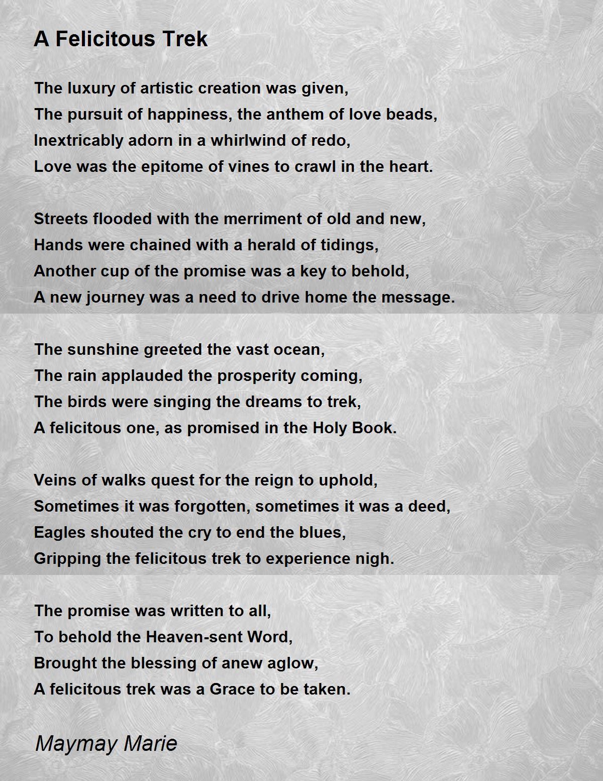 The sunshine greeted the vast ocean, The rain applauded the prosperity coming, The birds were singing the dreams to trek, A felicitous one, as promised in the Holy Book. beautiful description of nature. thank u poetess. tony