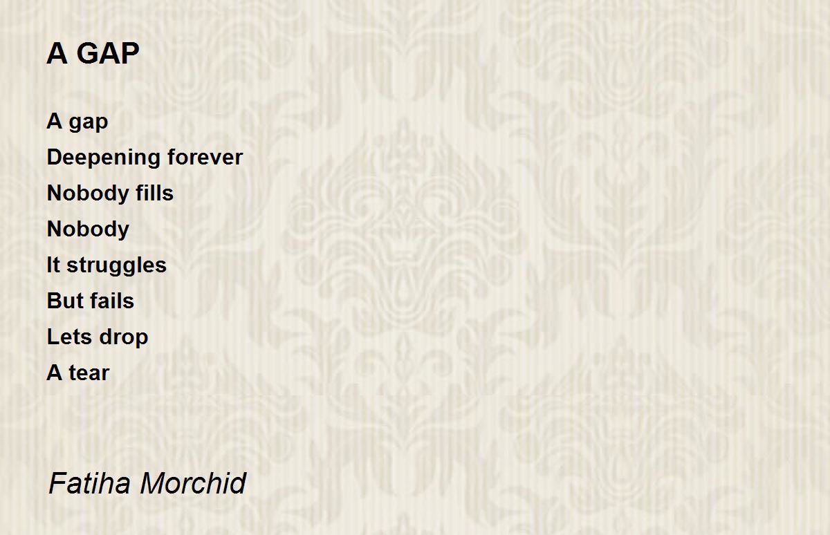 A gap Deepening forever Nobody fills Nobody It struggles But fails Lets drop A tear