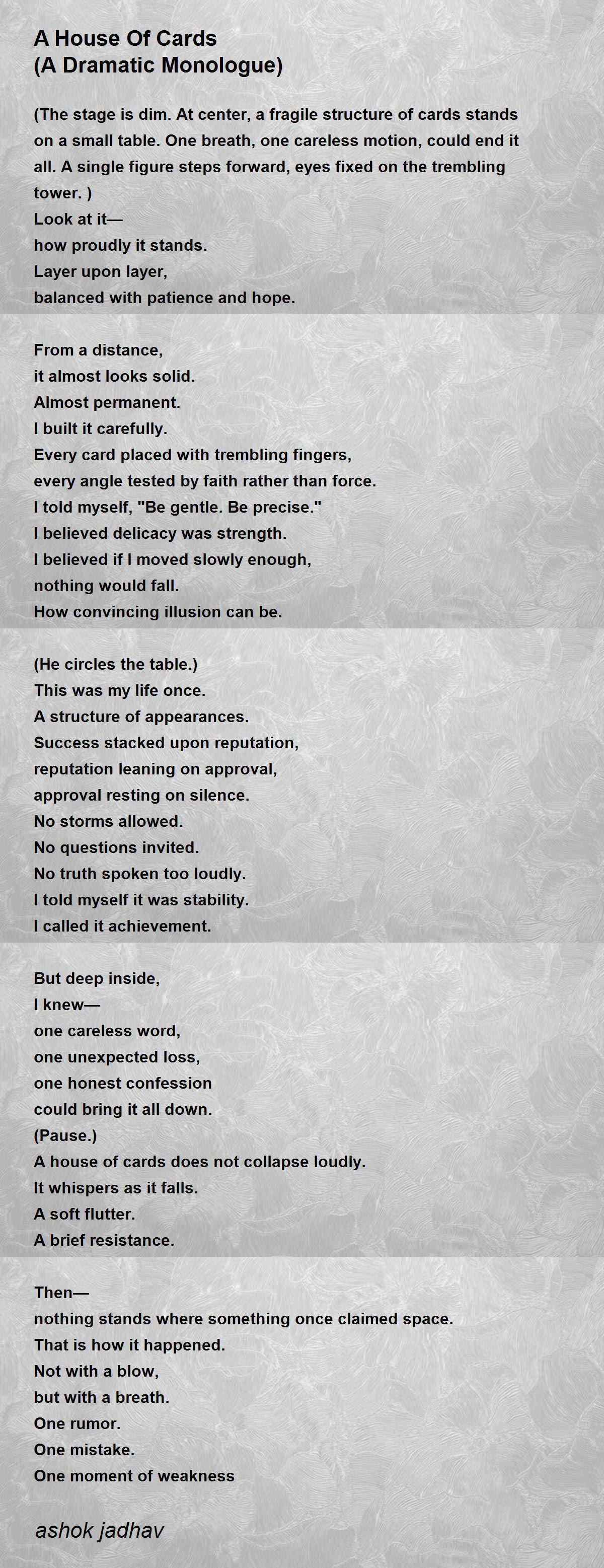 (The stage is dim. At center, a fragile structure of cards stands on a small table. One breath, one careless motion, could end it all. A single figure steps forward, eyes fixed on the trembling tower.)