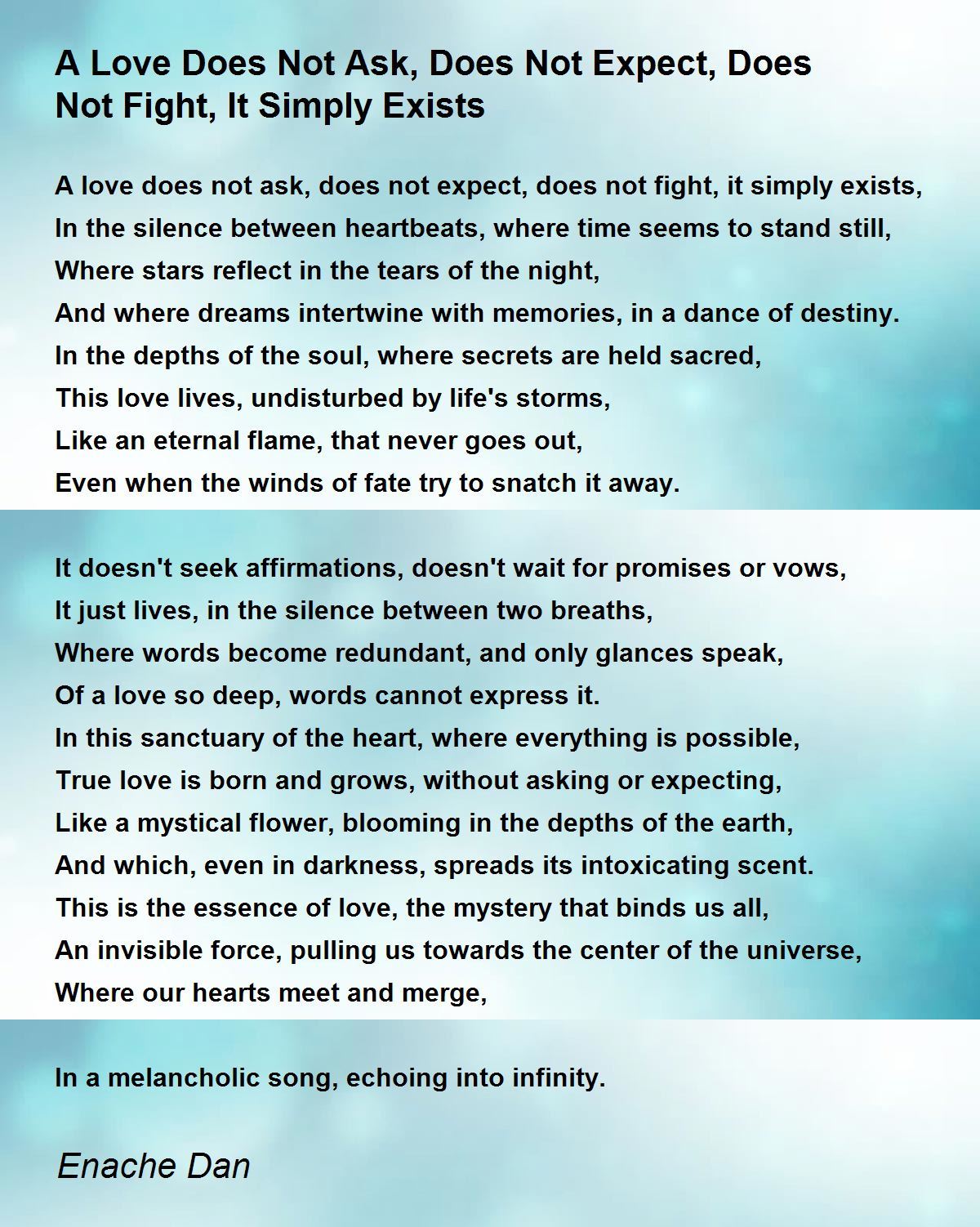 A love does not ask, does not expect, does not fight, it simply exists,