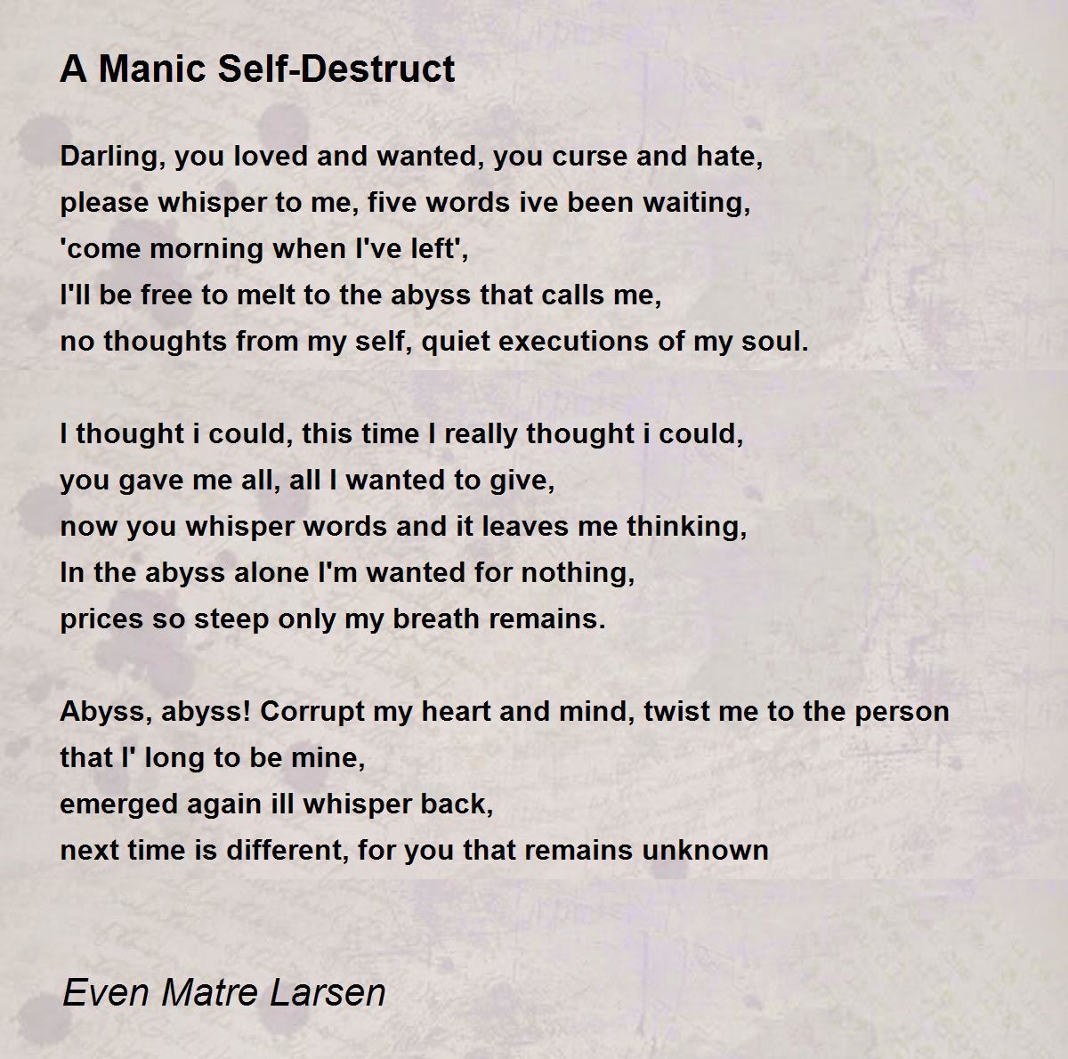 Abyss, abyss! Corrupt my heart and mind, twist me to the person that I' long to be mine,