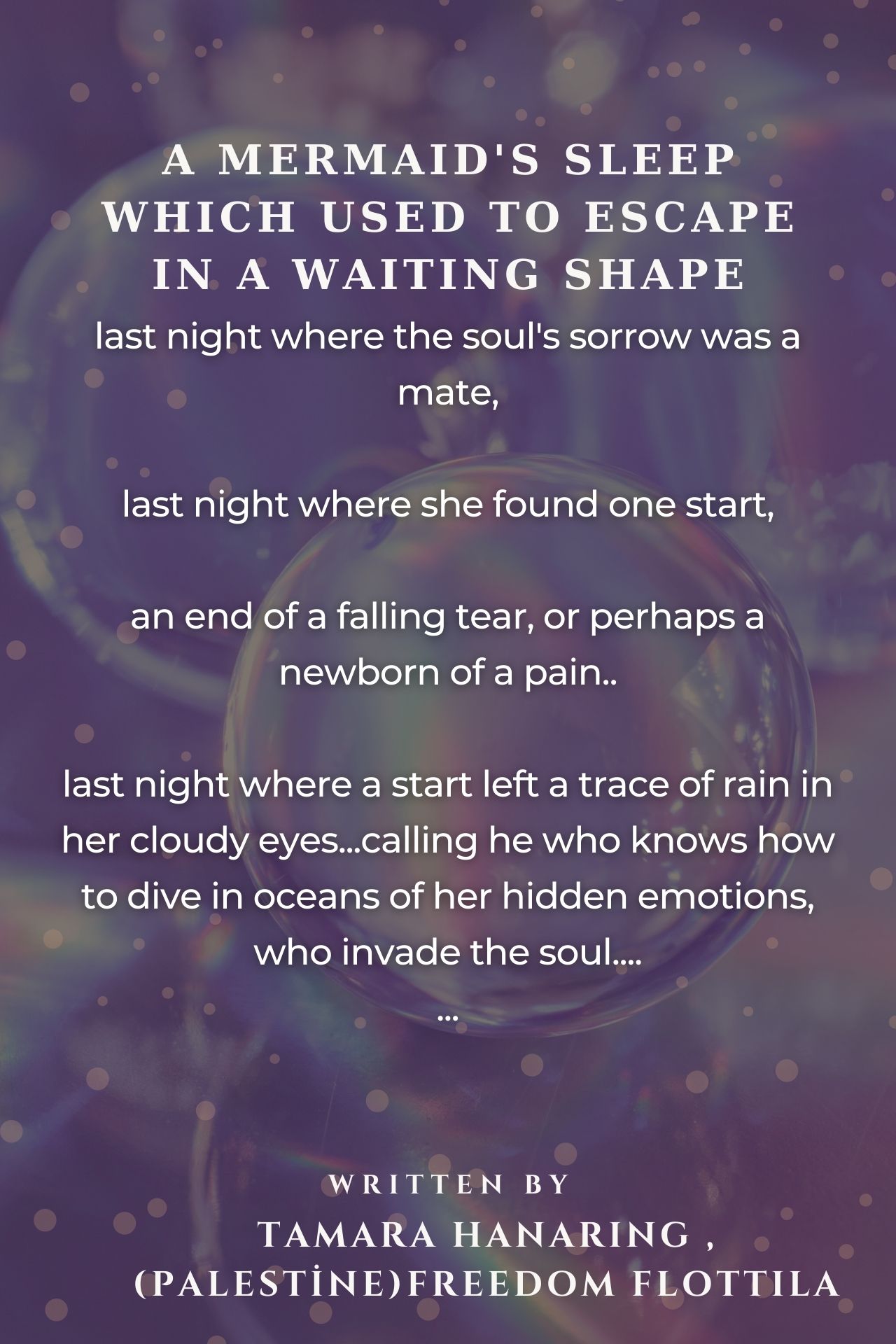 A Mermaid's SleeP WhicH used to EscapE In A WaitinG ShapE is a poem lush with lovely lines all through especially ' last night where the soul's sorrow was a mate, / last night where she found one start, / an end of a falling tear, or perhaps a newborn of a pain.. / last night where a start left a trace of rain in her cloudy eyes...calling he who knows how to dive in oceans of her hidden emotions, who invade the soul....'