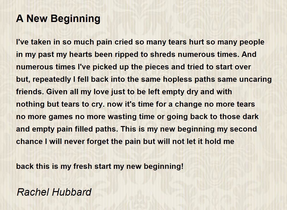 I've taken in so much pain cried so many tears hurt so many people in my past my hearts been ripped to shreds numerous times. And numerous times I've picked up the pieces and tried to start over but, repeatedly I fell back into the same hopless paths same uncaring friends. Given all my love just to be left empty dry and with nothing but tears to cry. now it's time for a change no more tears no more games no more wasting time or going back to those dark and empty pain filled paths. This is my new beginning my second chance I will never forget the pain but will not let it hold me back this is my fresh start my new beginning!
