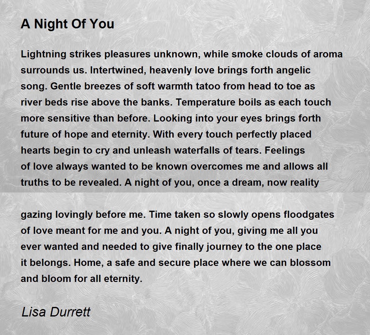 Lightning strikes pleasures unknown, while smoke clouds of aroma surrounds us. Intertwined, heavenly love brings forth angelic song. Gentle breezes of soft warmth tatoo from head to toe as river beds rise above the banks. Temperature boils as each touch more sensitive than before. Looking into your eyes brings forth future of hope and eternity. With every touch perfectly placed hearts begin to cry and unleash waterfalls of tears. Feelings of love always wanted to be known overcomes me and allows all truths to be revealed. A night of you, once a dream, now reality gazing lovingly before me. Time taken so slowly opens floodgates of love meant for me and you. A night of you, giving me all you ever wanted and needed to give finally journey to the one place it belongs. Home, a safe and secure place where we can blossom and bloom for all eternity.