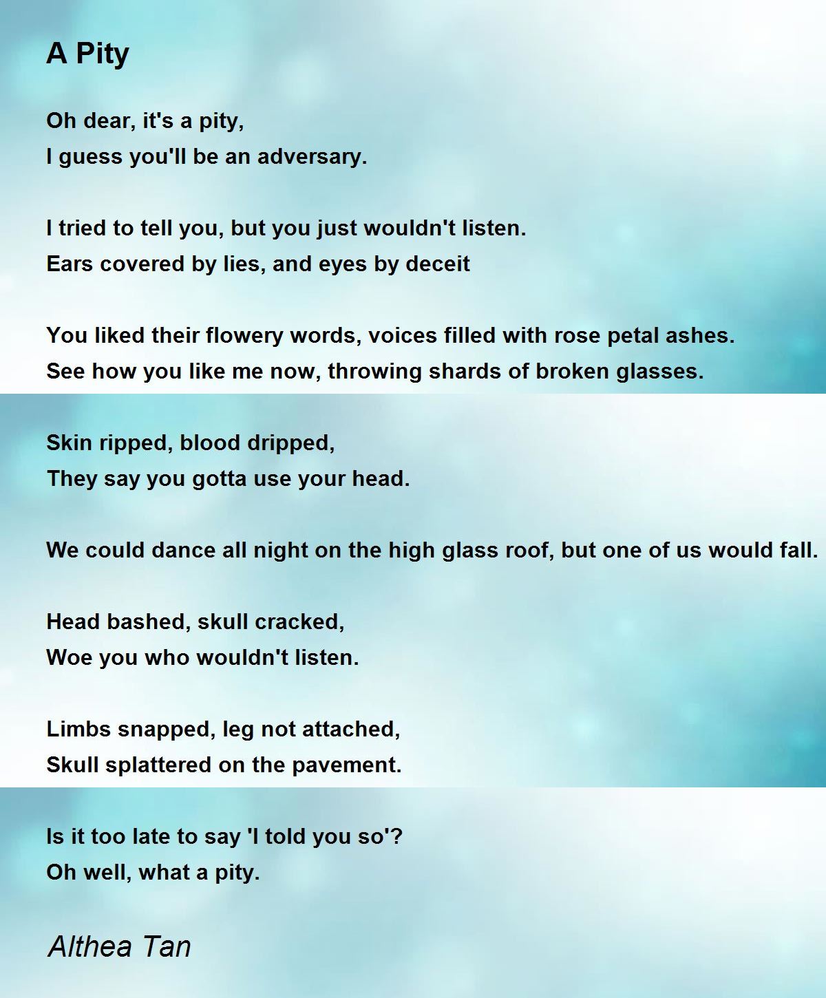 See how you like me now, throwing shards of broken glasses.