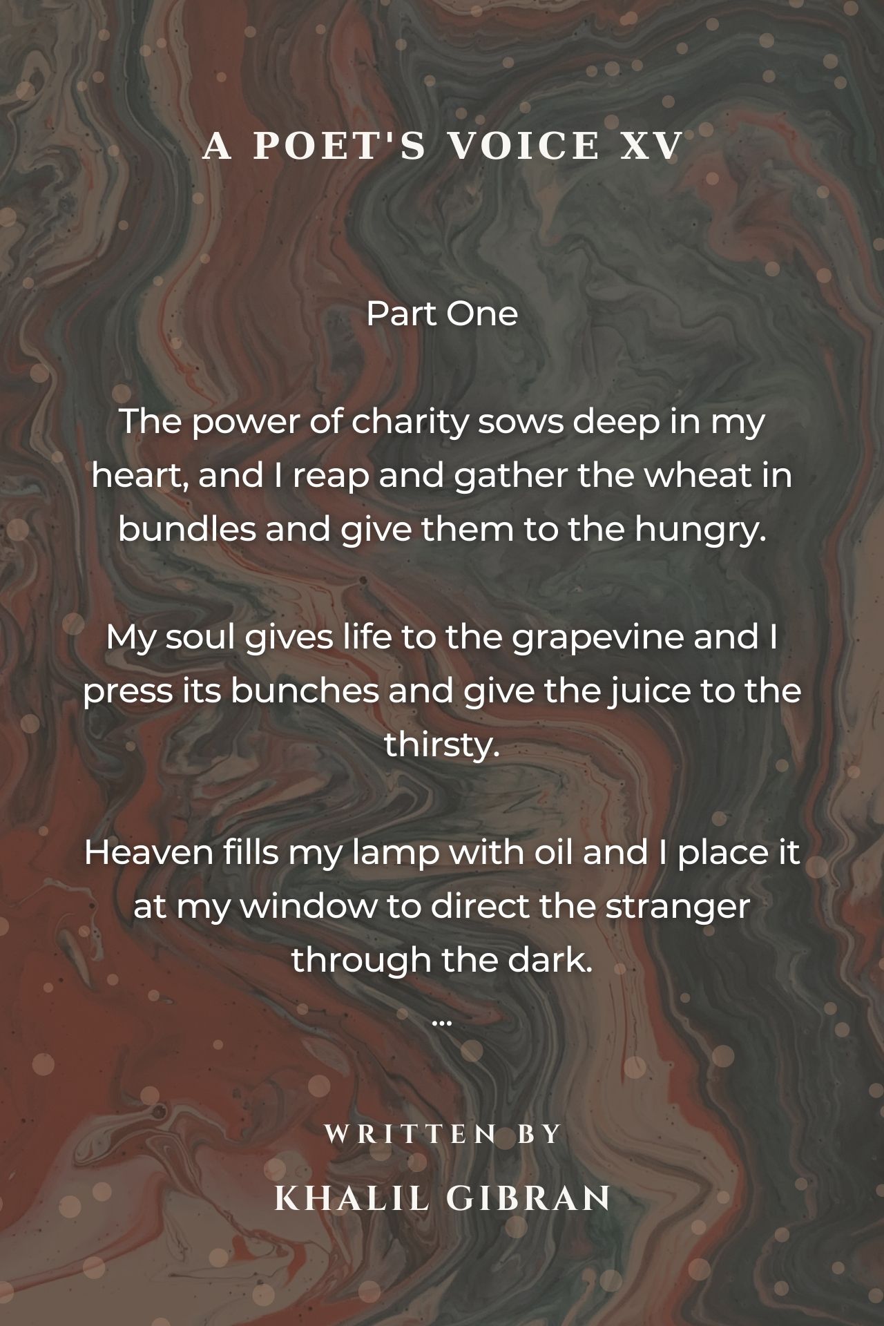 The power of charity sows deep in my heart, and I reap and gather the wheat in bundles and give them to the hungry.