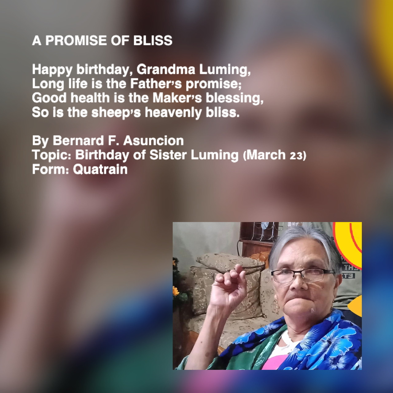 And from my side Congratulations and Happy BirthDay Grandma Luming! God's Blessings in Abundance for you especially on your Birthday til the next birthday! Such adorable photograph Rev. Bernard Sir! Such an inspiring poem! 5 Stars!