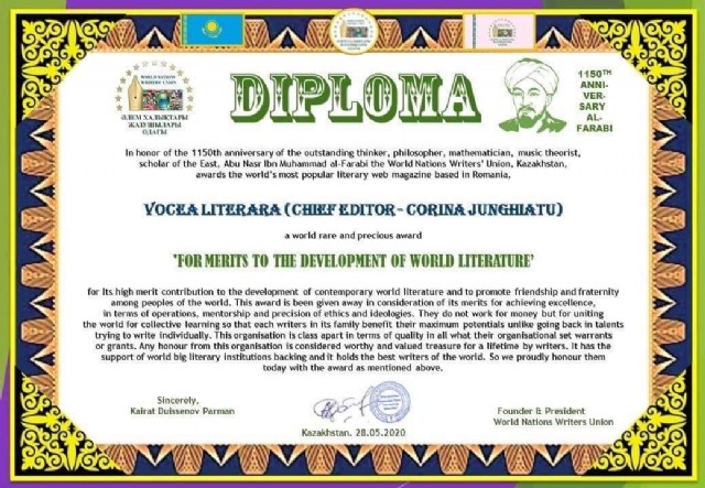 As we had announced two days back, the World Nations Writers Union intends to give a rare and exclusive award to some selfless literary institutions which has very high standards of operations and serves the world of literature selflessly. These institutions or entities has been very instrumental in guiding, coaching, inspiring and developing writers to be as best in the world. It was my decision as the founder of WNWU to identify such institutions or platforms which supports and provided all facilities to empower world writers. These platforms or institutions work selflessly keeping general interest of writers from around the world. Thus in honor of the 1150th anniversary of the outstanding thinker, philosopher, mathematician, music theorist, scholar of the East, Abu Nasr Ibn Muhammad al-Farabi the World Nations Writers' Union, Kazakhstan in general, and myself being it's founder and president, take happiness in awarding a world rare and precious prize 'FOR MERITS TO THE DEVELOPMENT OF WORLD LITERATURE' to the below mentioned world popular and very active web magazine based in Romania.