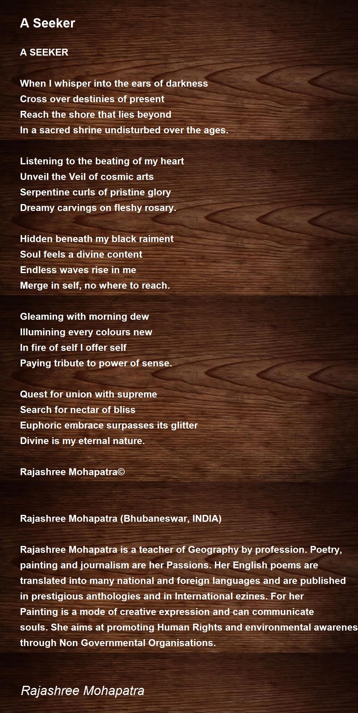 Rajashree Mohapatra is a teacher of Geography by profession. Poetry, painting and journalism are her Passions. Her English poems are translated into many national and foreign languages and are published in prestigious anthologies and in International ezines. For her Painting is a mode of creative expression and can communicate souls. She aims at promoting Human Rights and environmental awareness through Non Governmental Organisations.