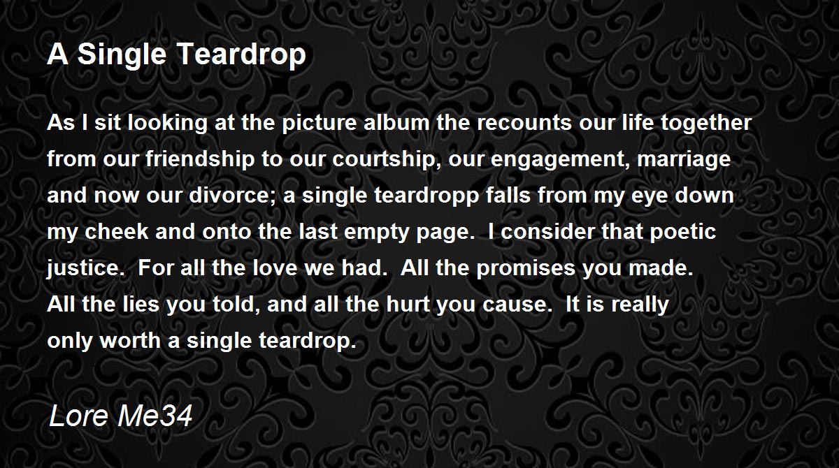 As I sit looking at the picture album the recounts our life together from our friendship to our courtship, our engagement, marriage and now our divorce; a single teardropp falls from my eye down my cheek and onto the last empty page. I consider that poetic justice. For all the love we had. All the promises you made. All the lies you told, and all the hurt you cause. It is really only worth a single teardrop.