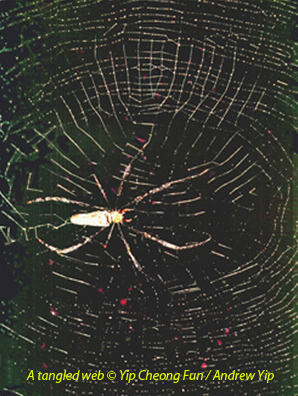 A web of twisted threads the weaving spider hung
