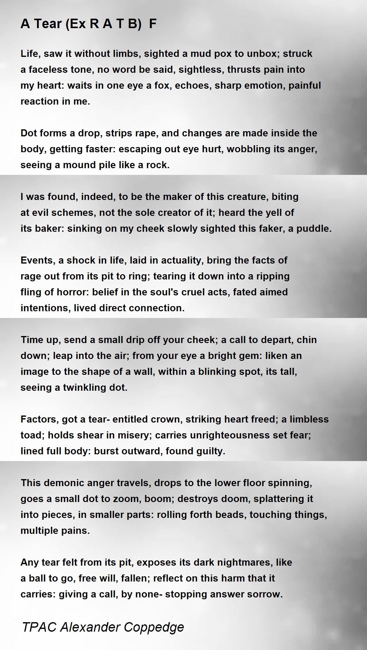 Any tear felt from its pit, exposes its dark nightmares, like a ball to go, free will, fallen; reflect on this harm that it carries: giving a call, by none-stopping answer sorrow.
