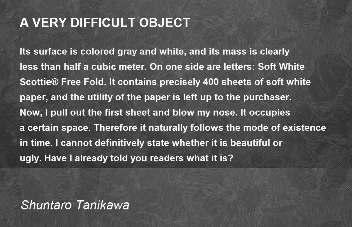 Its surface is colored gray and white, and its mass is clearly less than half a cubic meter. On one side are letters: Soft White Scottie® Free Fold. It contains precisely 400 sheets of soft white paper, and the utility of the paper is left up to the purchaser. Now, I pull out the first sheet and blow my nose. It occupies a certain space. Therefore it naturally follows the mode of existence in time. I cannot definitively state whether it is beautiful or ugly. Have I already told you readers what it is?