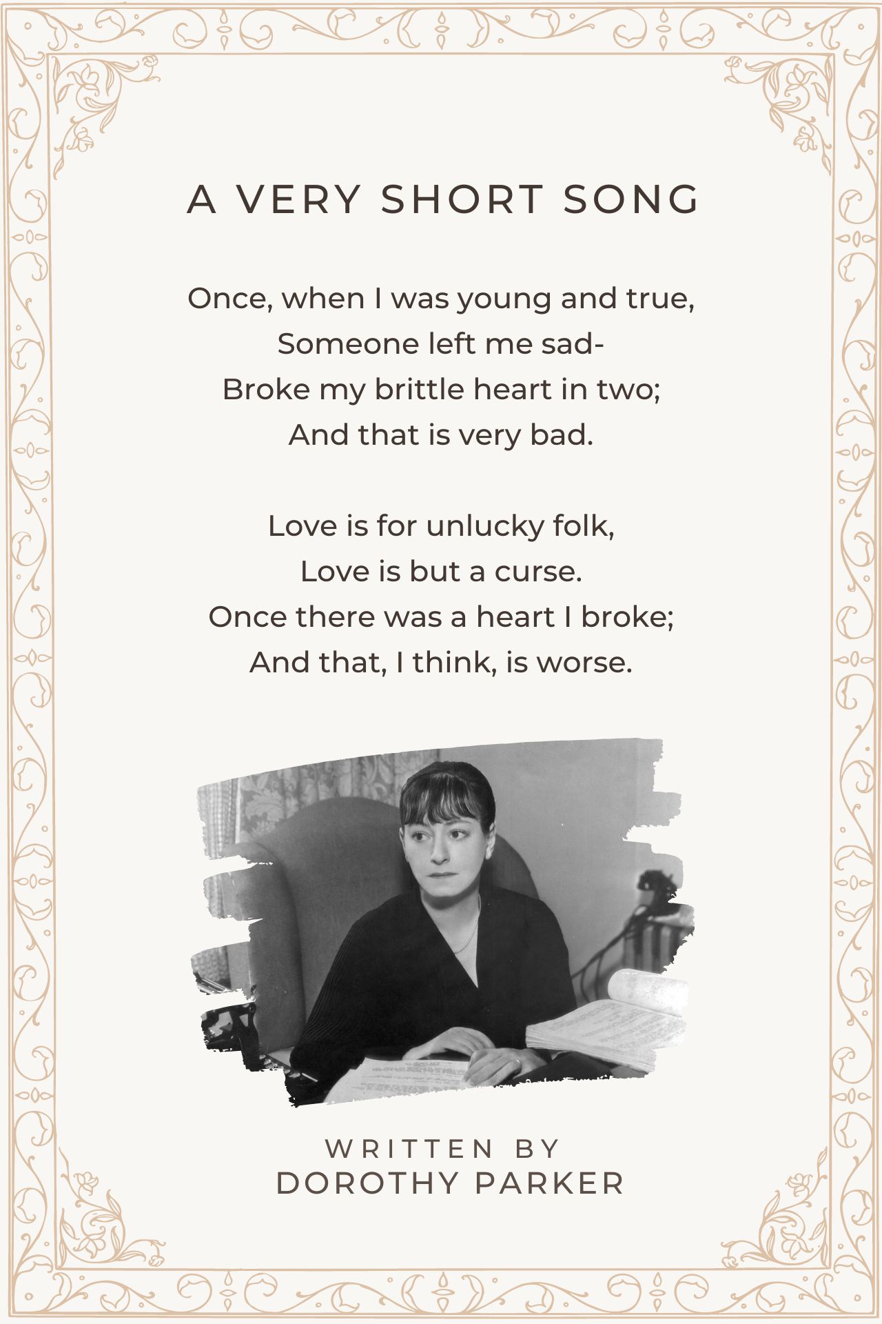 Parker is a classic artist of poetry - her style is readable and can easily understood by readers. She has a talent for adding wit and humor in her poems. This is one of them.