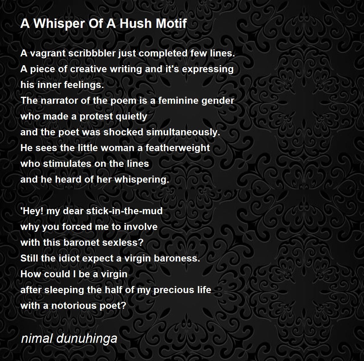 An amazing poem in which what is not said resounds louder than what is being said. Very interesting, Nimal. Warm regards, Sandra