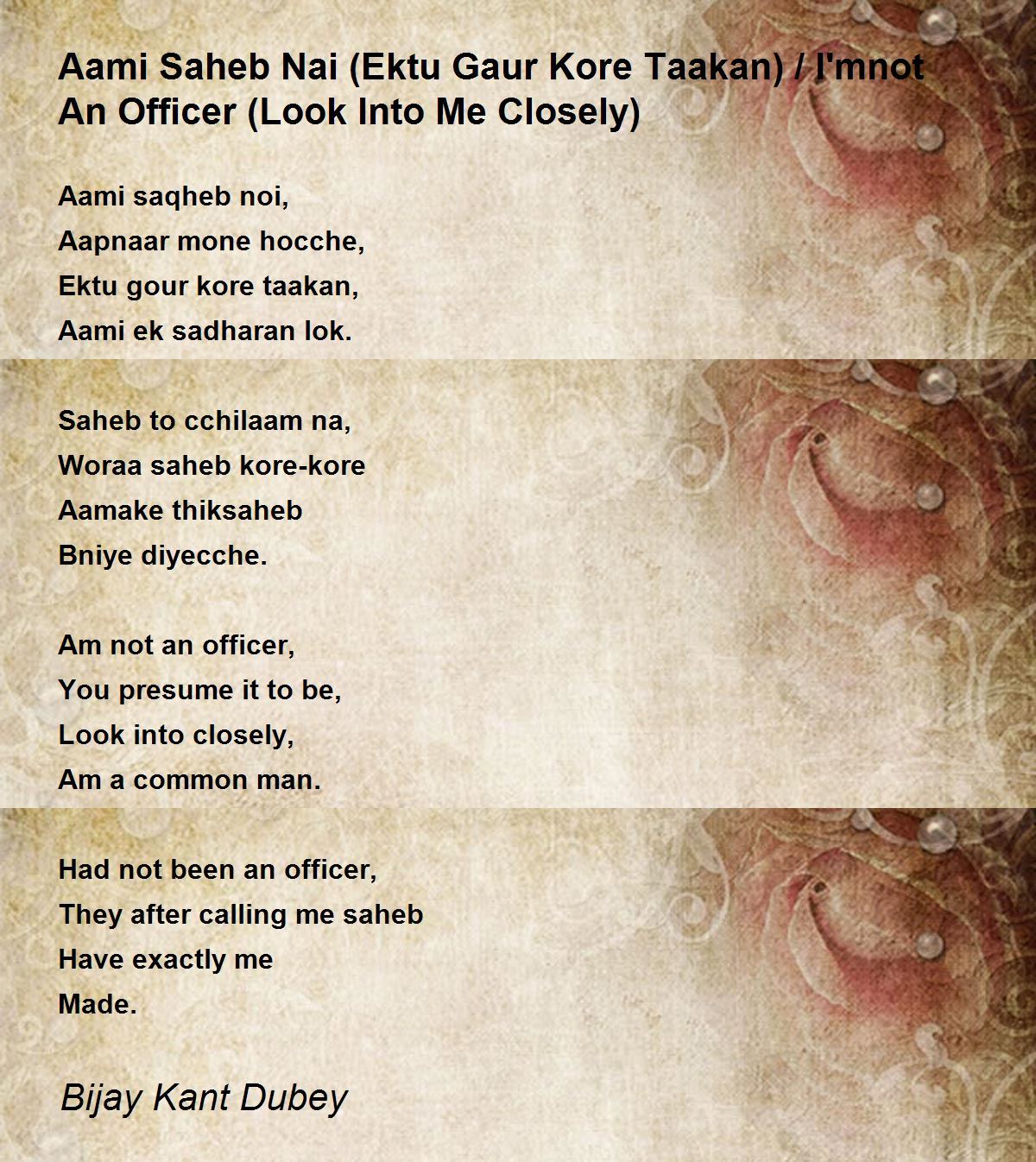 Aami saqheb noi, Aapnaar mone hocche, Ektu gour kore taakan, Aami ek sadharan lok......haunting expression with lofty theme. Beautiful poem. Thank you for juxtaposition of english transaltion.