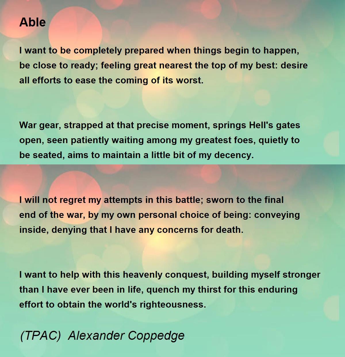I want to help with this heavenly conquest, building myself stronger than I have ever been in life, quench my thirst for this enduring effort to obtain the world's righteousness.